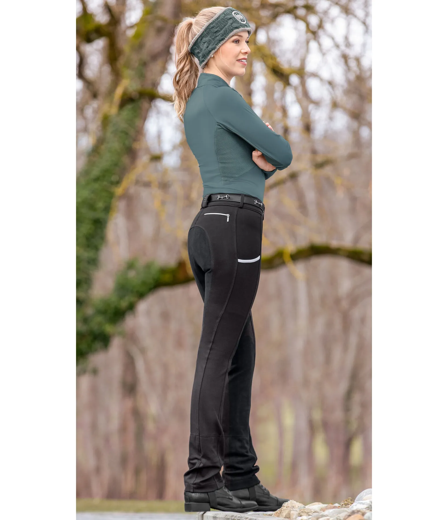 Pantalon d’équitation jodphur confortable. Fond intégral en synthétique. Large ceinture élastiquée avec deux boutons. Une poche zippée arrière et une poche pour téléphone portable sur la jambe. Broderie Felix Bühler à l’arrière. Bas de jambe évasé. Sous-pieds réglables. Matière très extensible et extrêmement douce. 68 % viscose, 27 % nylon, 5 % élasthanne.