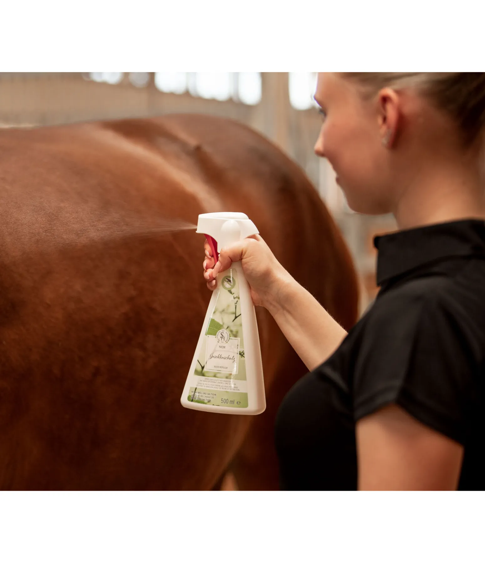 Spray de protection contre les insectes à base d’extrait de margousier et de saltidine (icaridine). Celui-ci est obtenu comme huile végétale par pression à froid des graines et des drupes du neem. Par conséquent, son utilisation est particulièrement recommandée pour les chevaux à la peau sensible. Malgré le goût amer, qui est censé couper l’appétit des insectes, l’odeur est généralement perçue comme très agréable.
