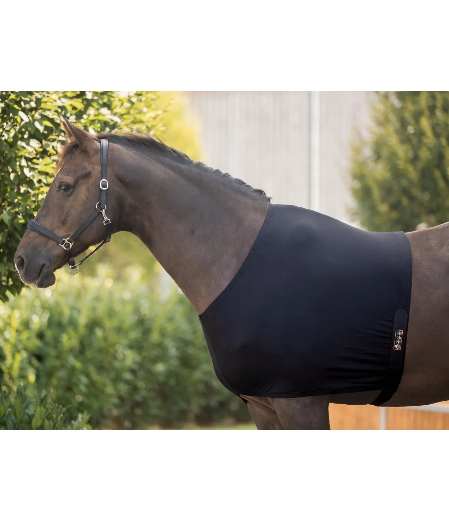 Protection d’épaules près du corps pour éviter les frottements (sous une couverture d’extérieur par exemple). Peut également avoir un effet bénéfique sur la détente des muscles des épaules, car le textile réfléchit la chaleur produite par le corps sous forme de rayonnement infrarouge. Sans couture le long du dos pour éviter les frottements sur le garrot et assurer un confort optimal. La protection d’épaules peut être simplement enfilée par la tête et dispose d’une sangle ventrale avec patte auto-agrippante ajustable à la morphologie du cheval. 82 % polyester, 18 % élasthanne.