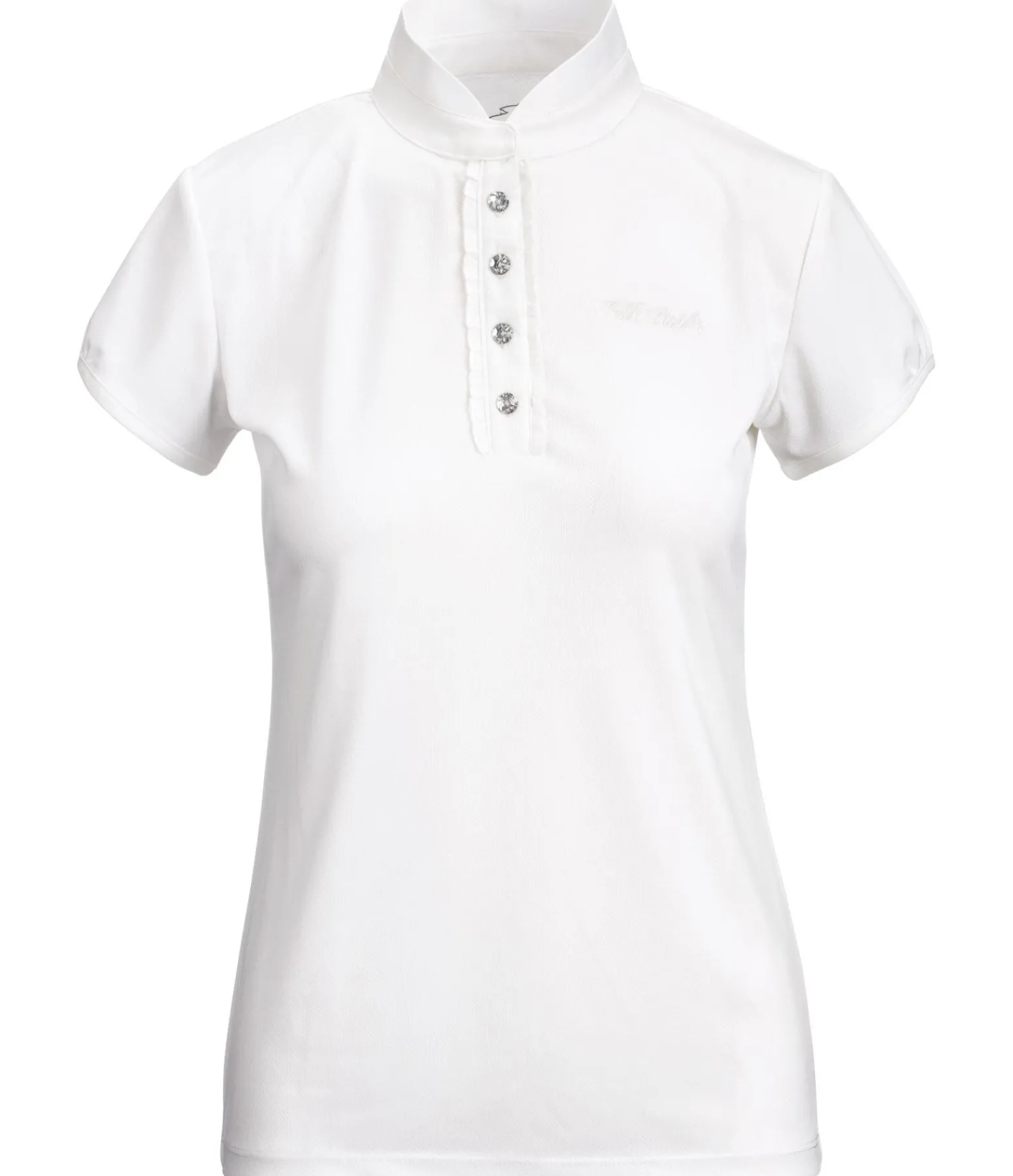 T-shirt de concours technique, élégant et léger. Tissu respirant, extensible dans 4 directions et à séchage rapide. Éléments raffinés tels que les boutons en strass, la patte de boutonnage froncée et les manches courtes. Coupe féminine. 100 % polyester.