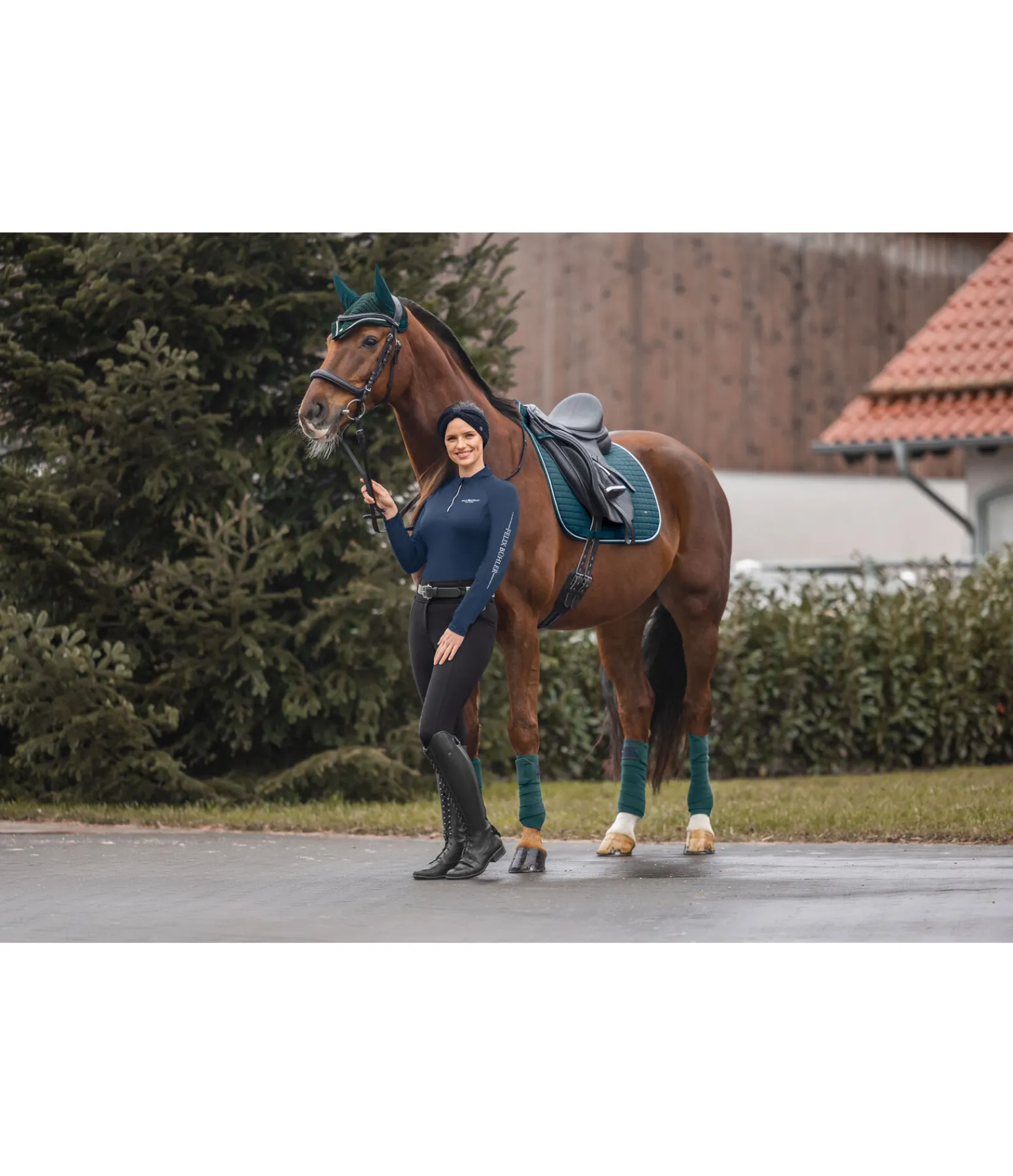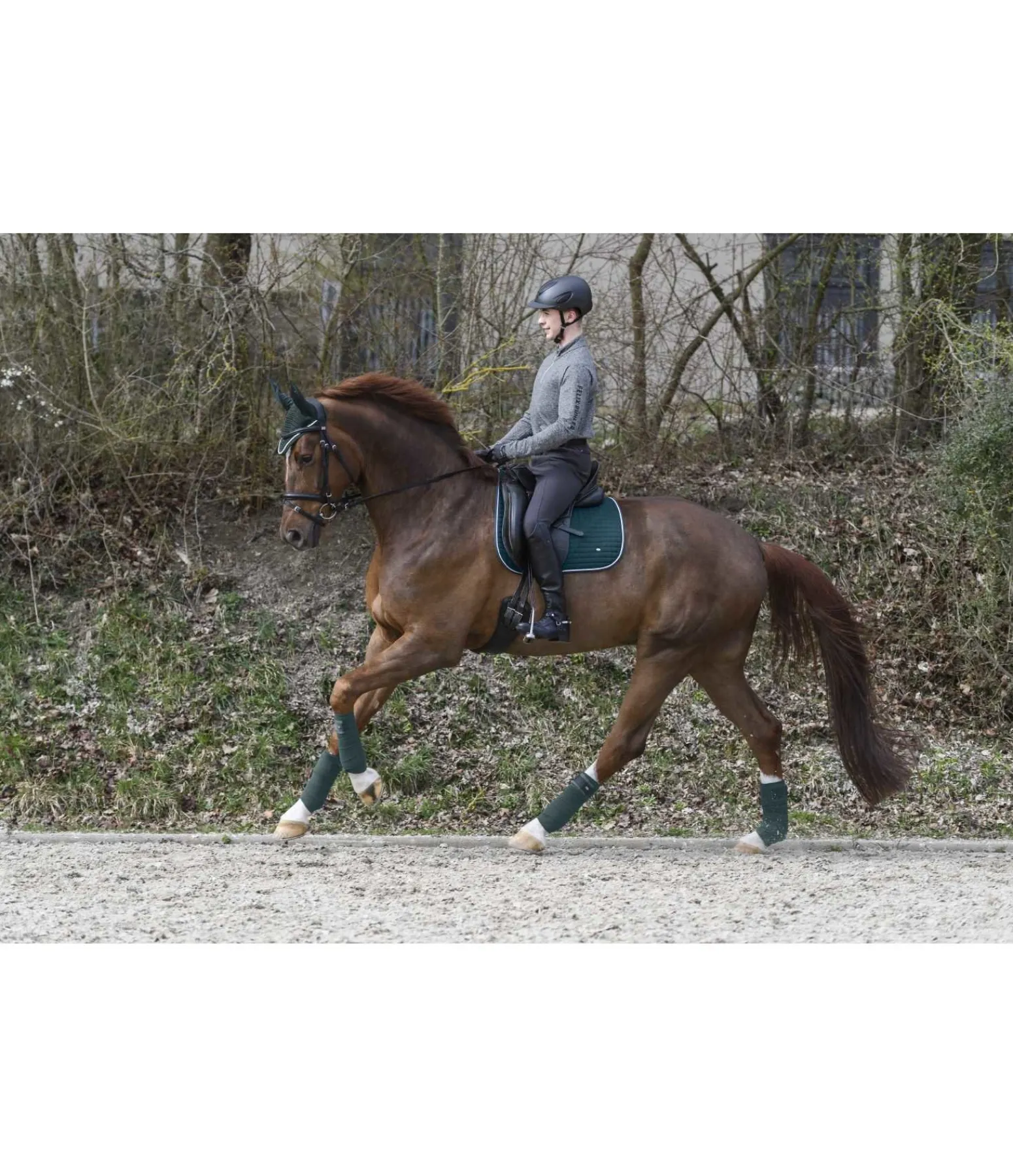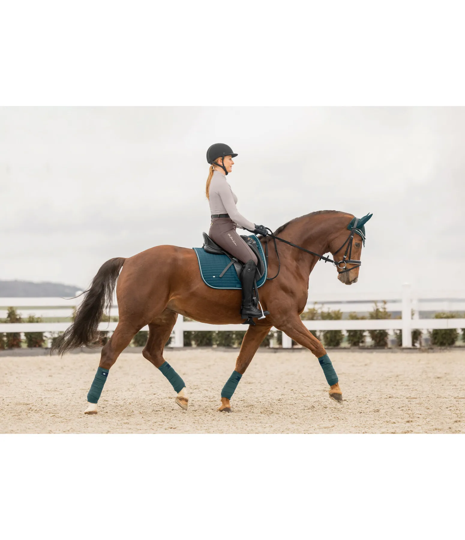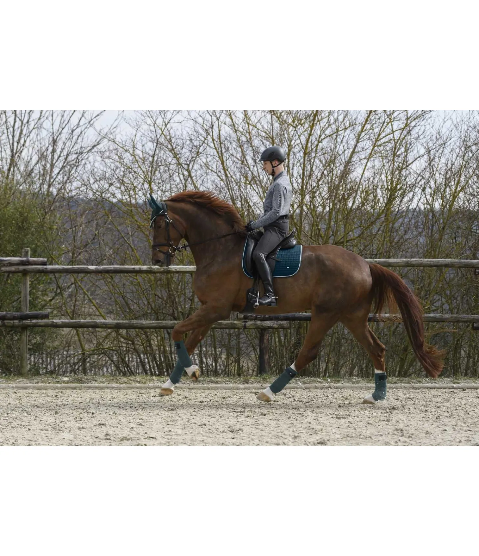 Tapis de selle en coton sobre et indéformable grâce au matelassage resserré, avec bordure colorée et petite plaque métallique argentée avec logo gravé. Passants de sangle et de contre-sanglons avec patte auto-agrippante pratique. Dessous en Air mesh respirant et absorbant l’humidité. Dessus 100 % coton, rembourrage et dessous 100 % polyester.