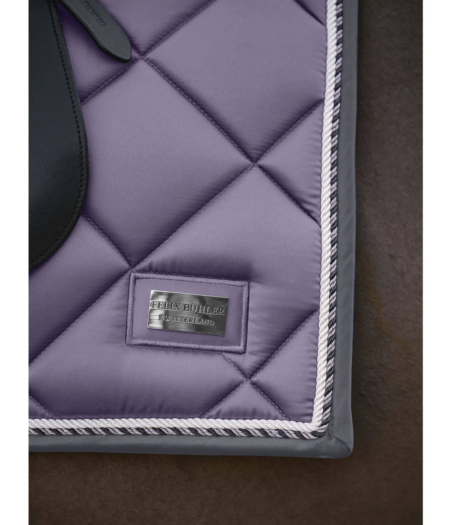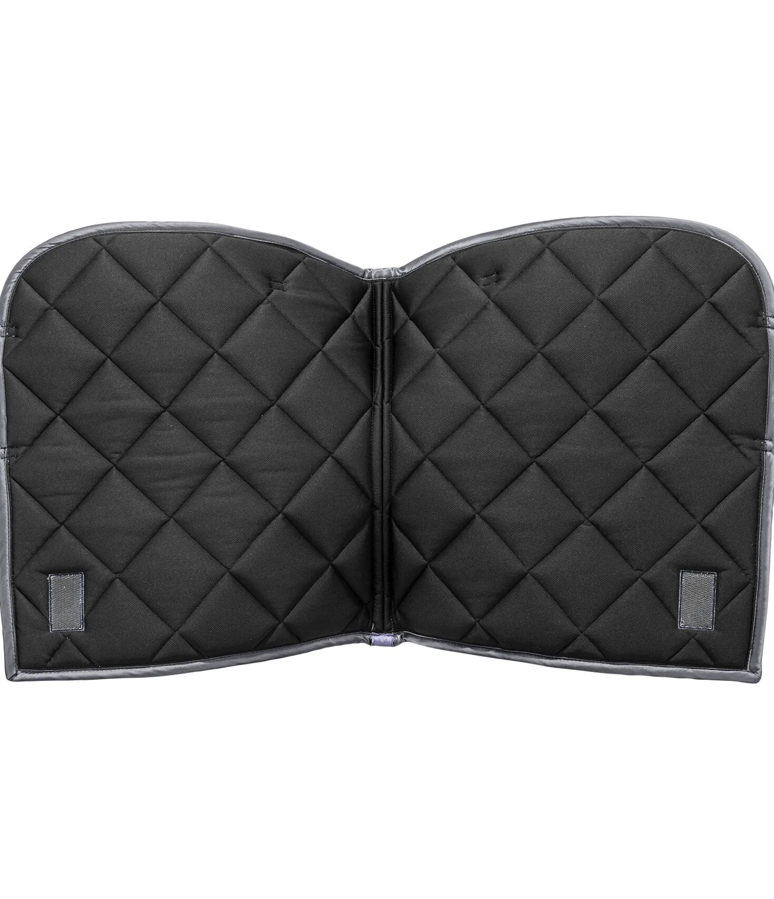 Tapis de selle de forme carrée. Petite plaque argentée avec logo. Tissu satiné. Cordons décoratifs de couleur assortie. Passants de sangle et de contre-sanglons avec patte auto-agrippante pratique. Dessous en Air mesh respirant et absorbant l’humidité. 100 % polyester.