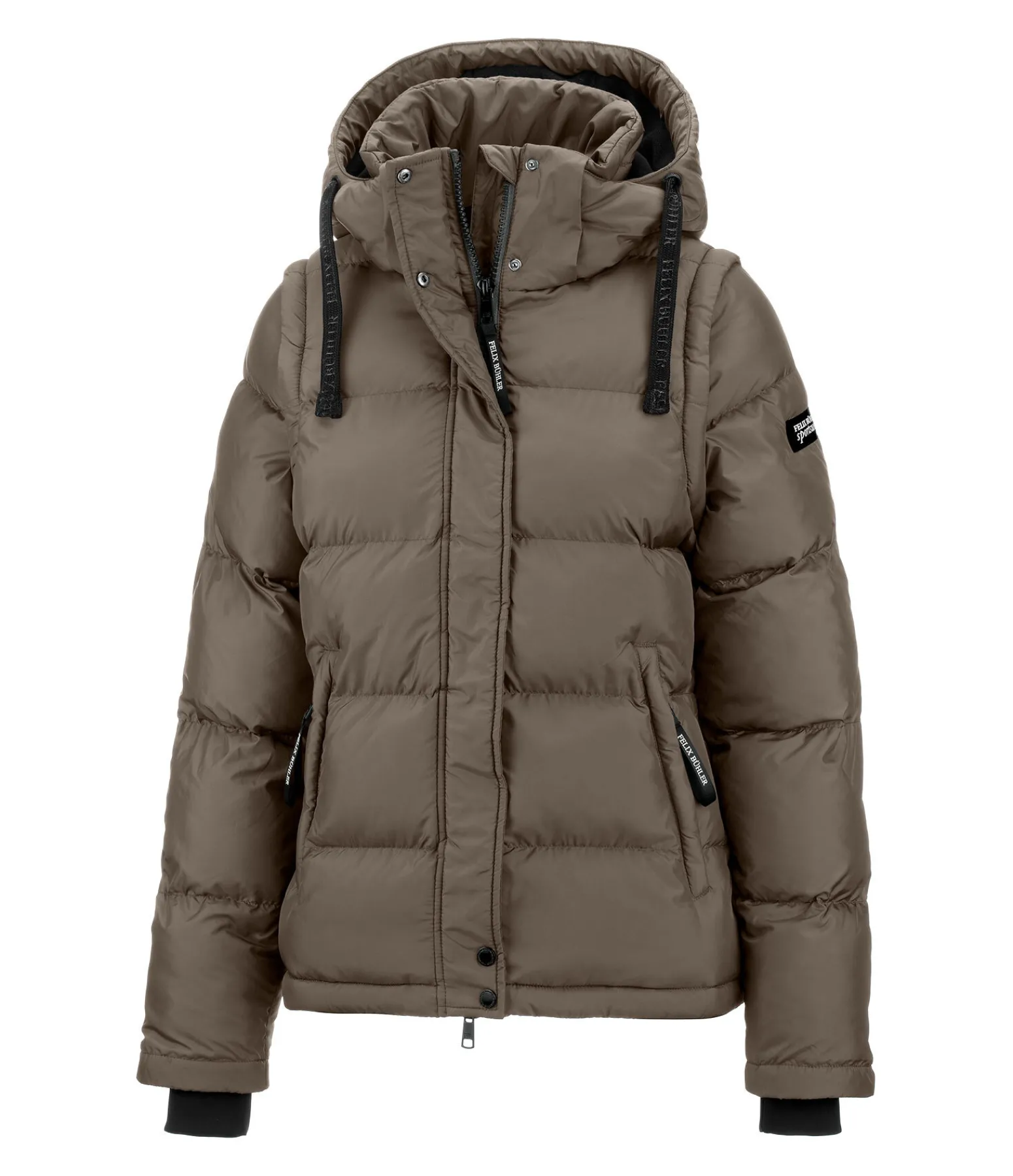 Une veste et un gilet en une seule pièce ! Veste d’équitation chaude avec manches amovibles zippées. Garnissage doux imitation duvet. Col montant. Capuche doublée en polaire, amovible et ajustable par cordon de serrage. Bouton-pression pour fixer la capuche dans le dos. Fermeture à glissière double sens dissimulée. 2 poches avant doublées en polaire, zippées et dissimulées. Badge Felix Bühler sur le bras. Finition en bord-côte sur le bas des manches. Taille ajustable par cordon de serrage. 100 % polyester.