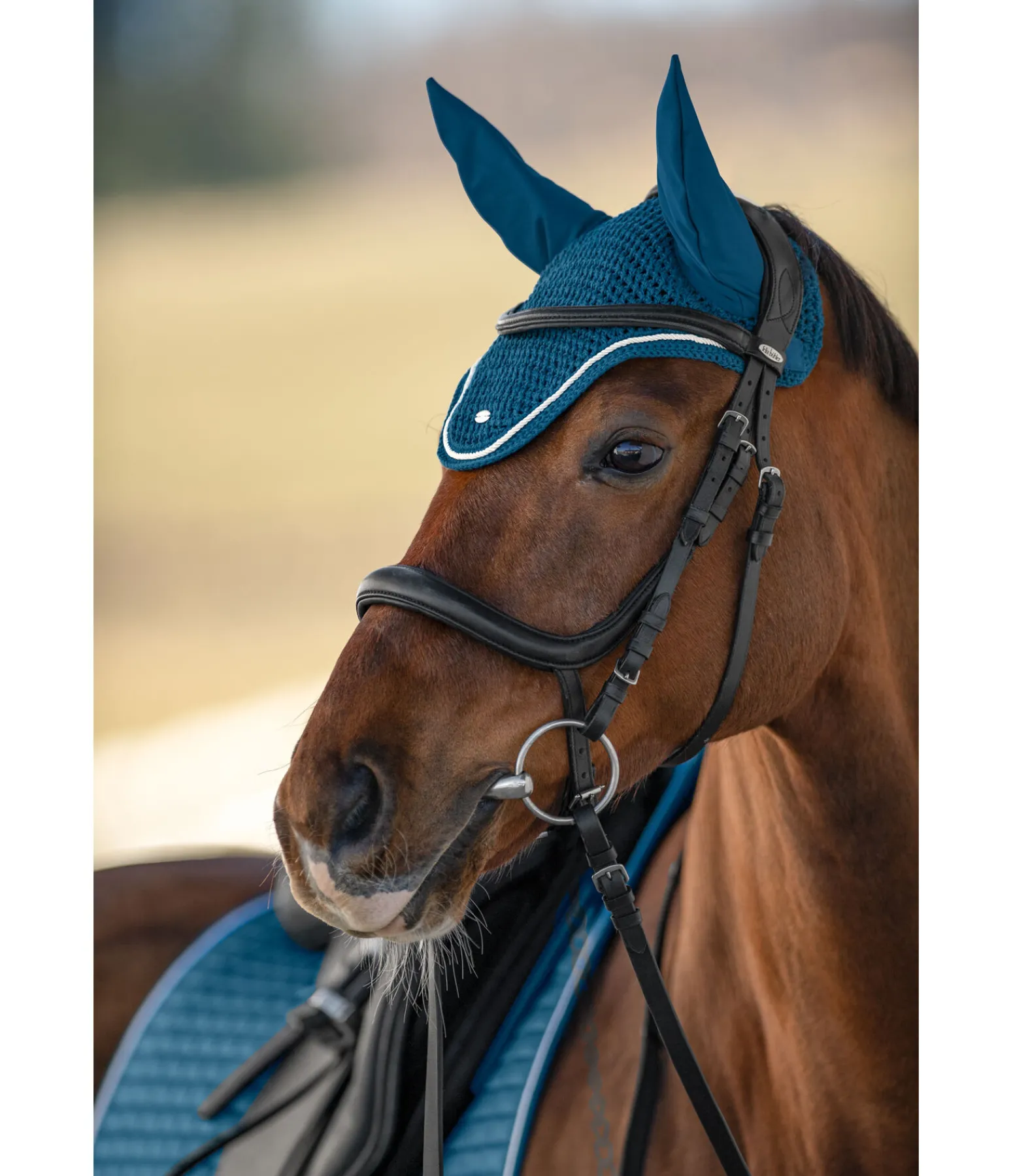 Bonnet anti-mouches classique en maille crochetée avec cordon décoratif satiné discret de couleur contrastante. Matière extensible aux oreilles. Petite plaque argentée filigrane avec logo gravé. Maille 100 % polyester, matière extensible 97 % polyester, 3 % élasthanne.