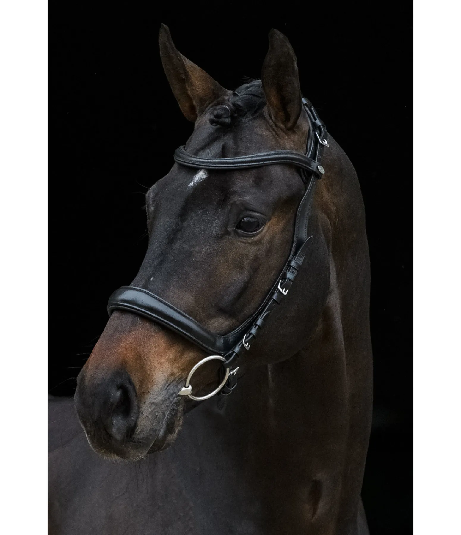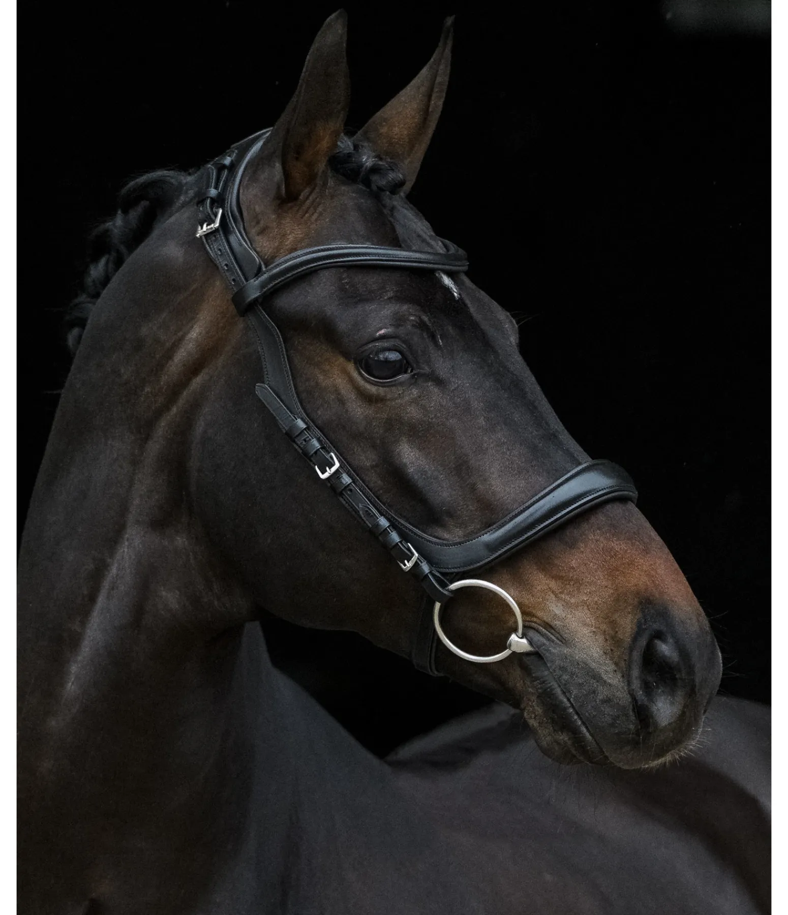 La coupe innovante des montants libère la zone autour des yeux afin d’éviter les pressions douloureuses et de ne pas gêner le champ de vision du cheval. La position basse de la muserolle garantit une meilleure fixité du mors et rend la coupe élégante. Le bridon se règle au niveau de la têtière, ce qui permet de n’avoir aucune boucle faisant pression sur les nerfs sensibles de la tête du cheval. La têtière anatomique large avec découpe aux oreilles est dotée d’une doublure douce en cuir véritable, tout comme le frontal et la muserolle française, pour un confort optimal. Sans noseband, afin d’éviter les pressions sur l’os du nez et de permettre une meilleure mastication. Cuir gras. Bouclerie argentée. Sans rênes, sans mors.