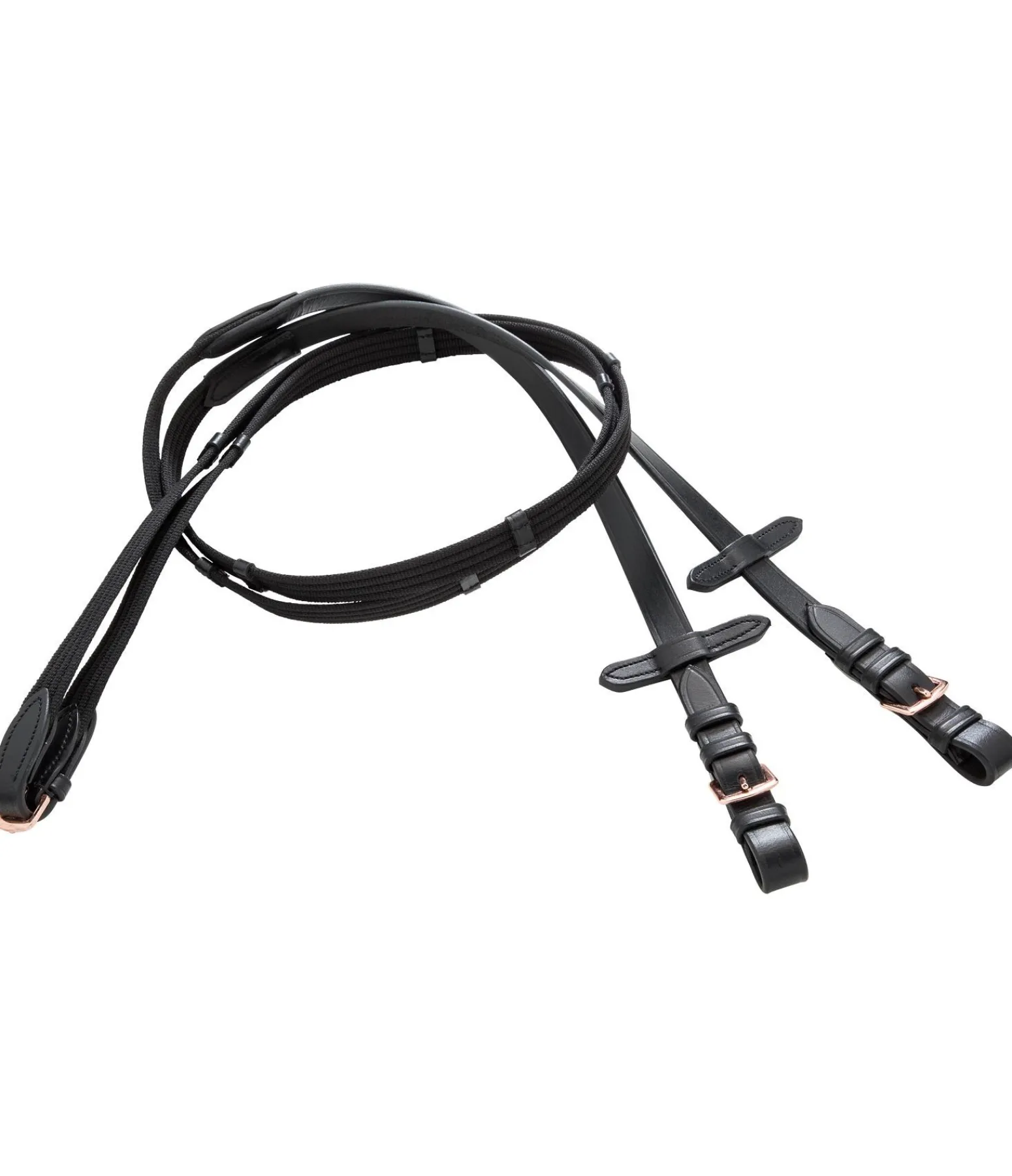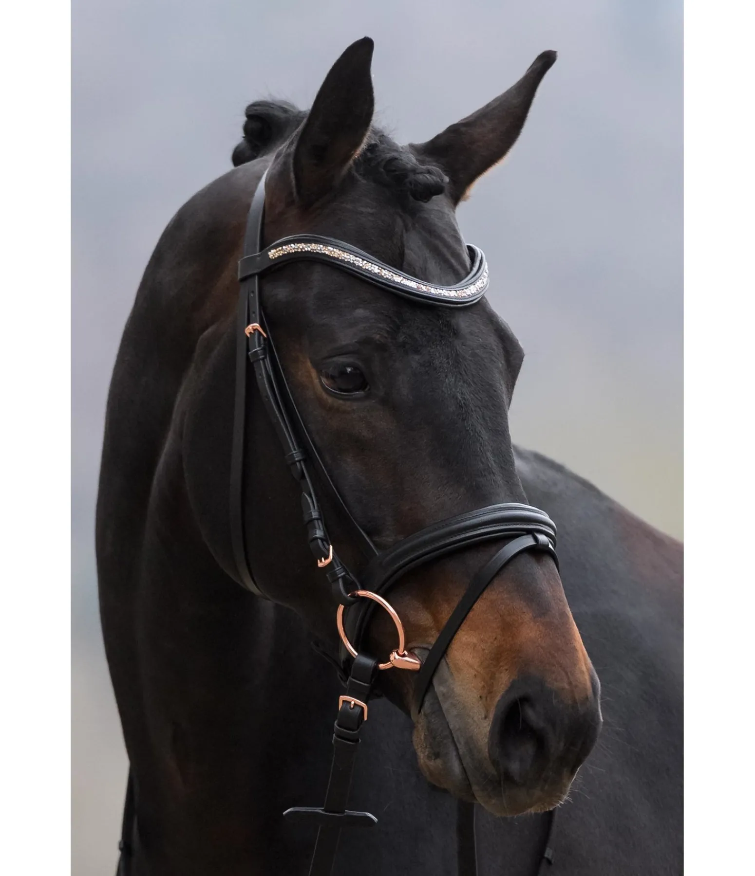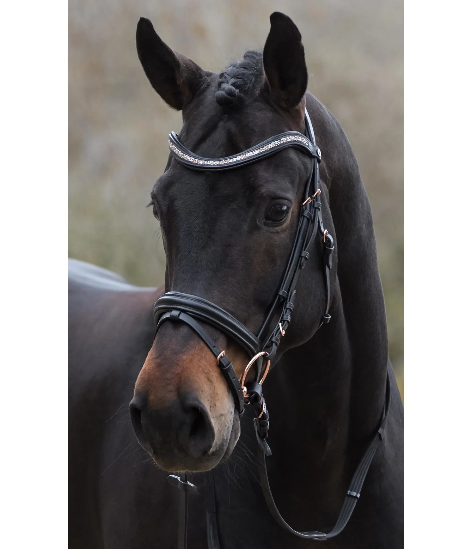 Bridon exceptionnel avec muserolle française combinée et frontal vague scintillant avec pierres scintillantes argentées et rose-doré. Frontal et muserolle avec doublure douce en cuir. Bouclerie rose doré. Avec rênes sangle, sans mors.