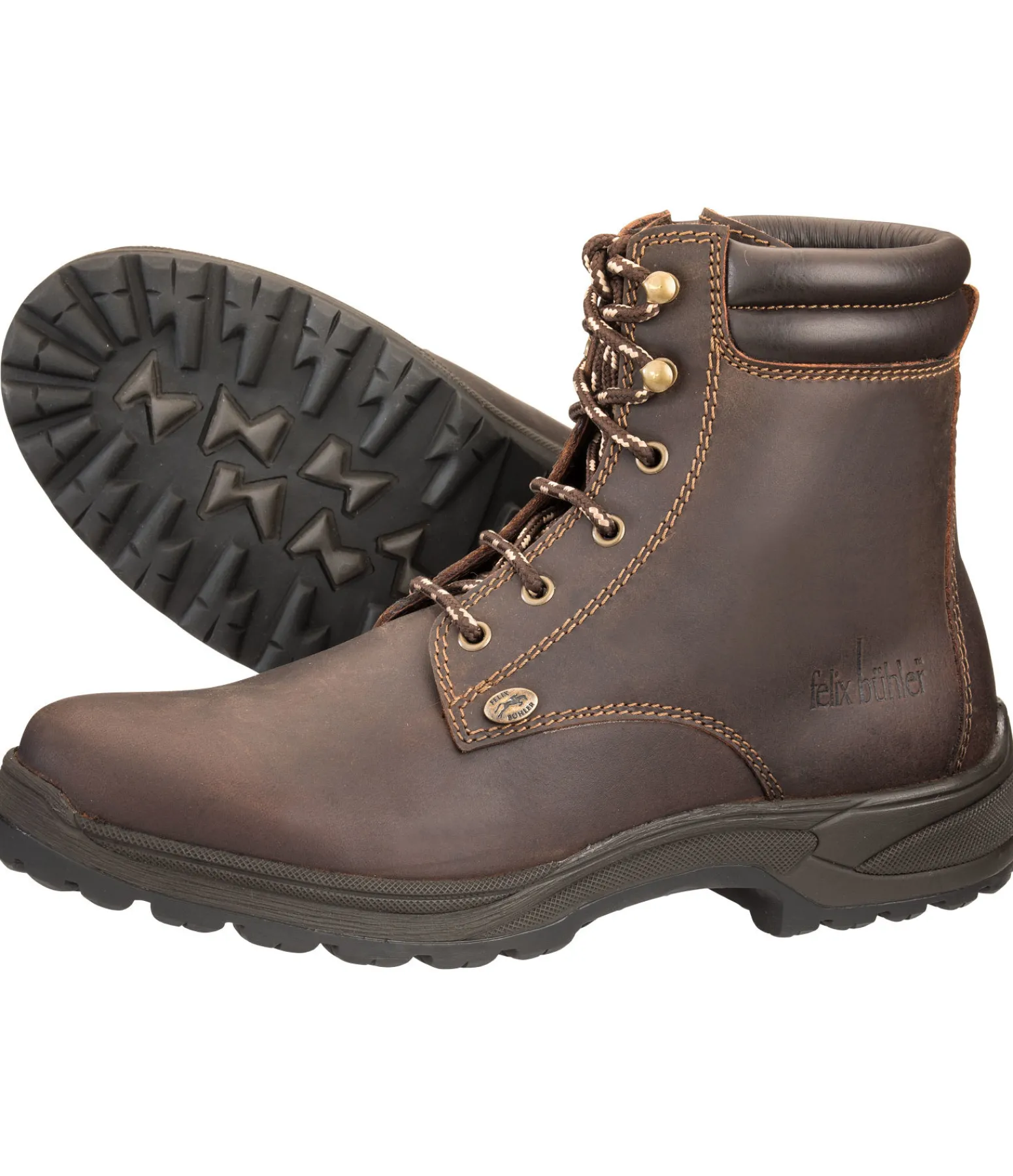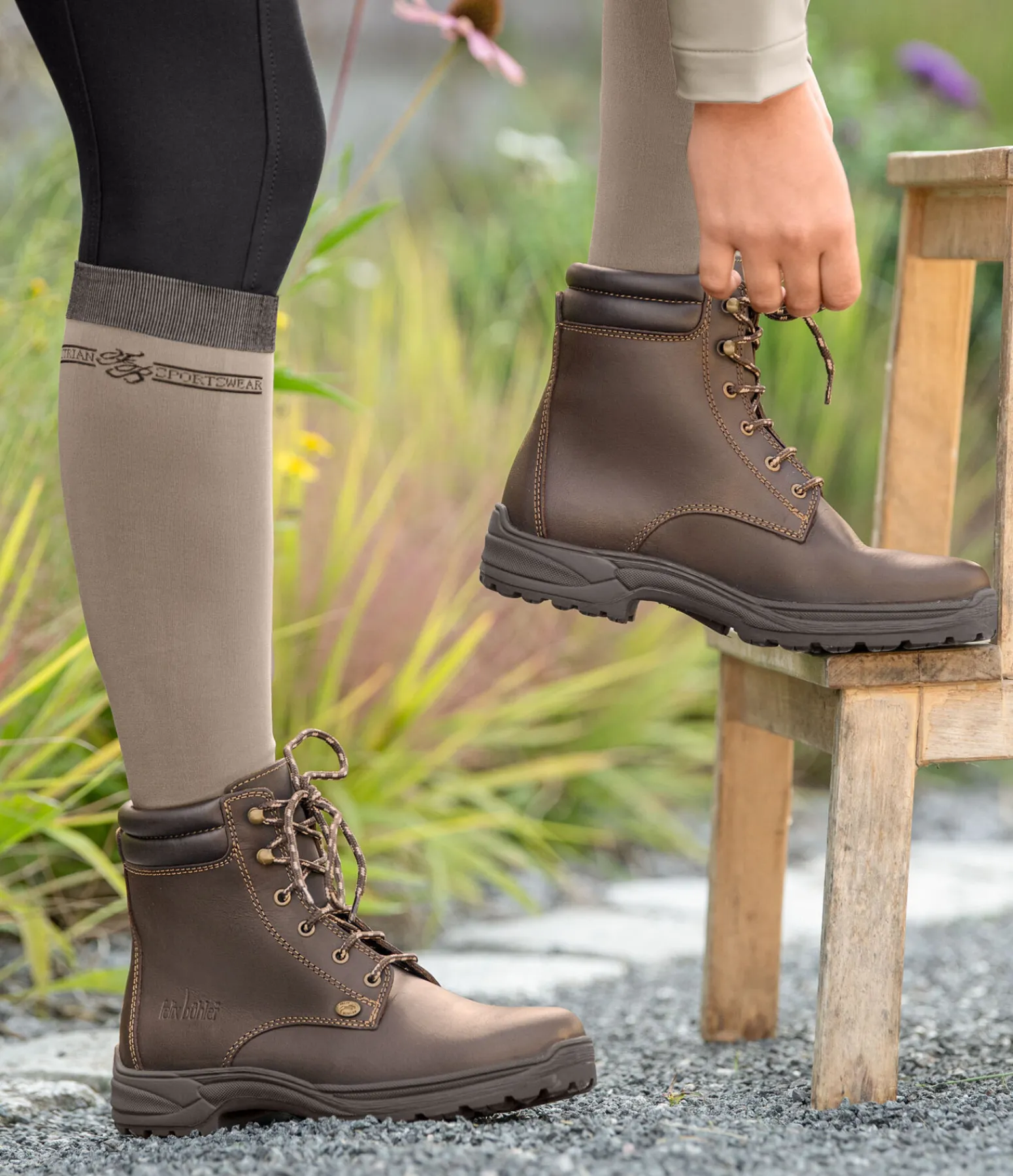 Chaussures d’écurie et d’équitation. Cuir gras résistant haut de gamme. Rembourrage doux à la cheville. Assise plantaire souple pour un confort optimal. Doublure intérieure en matière respirante (100 % polyester). Semelle crantée en caoutchouc solide et talon cavalier pour une adhérence optimale sur les sols glissants et dans les étriers. Semelle intérieure amortissante et amovible. Laçage rapide et pratique pour un enfilage et retrait sans difficulté. Fabriquées au Portugal.
