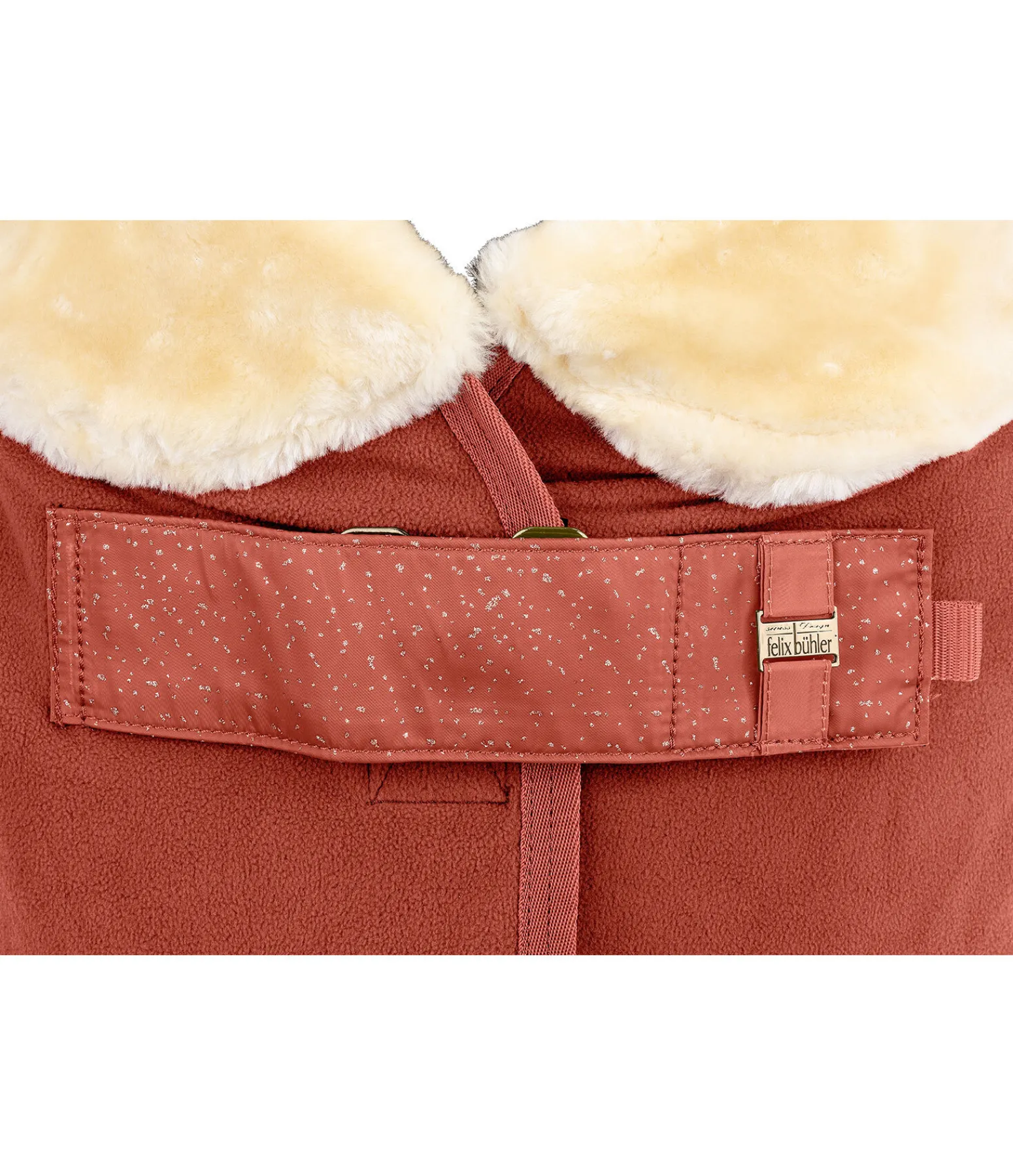 Chemise séchante chaude et douce avec col rembourré en polaire Teddy. Joli imprimé scintillant sur la partie arrière gauche de la couverture. Doublure lisse protégeant la robe au niveau des épaules et du poitrail, pour éviter les irritations dues aux frottements. Sursangles croisées amovibles de chaque côté. Fermeture de poitrail dissimulée avec crochet en T. Courroie de queue réglable incluse. Bouclerie argentée pour la couleur S et GA et rose doré pour la couleur NV. 100 % polyester.