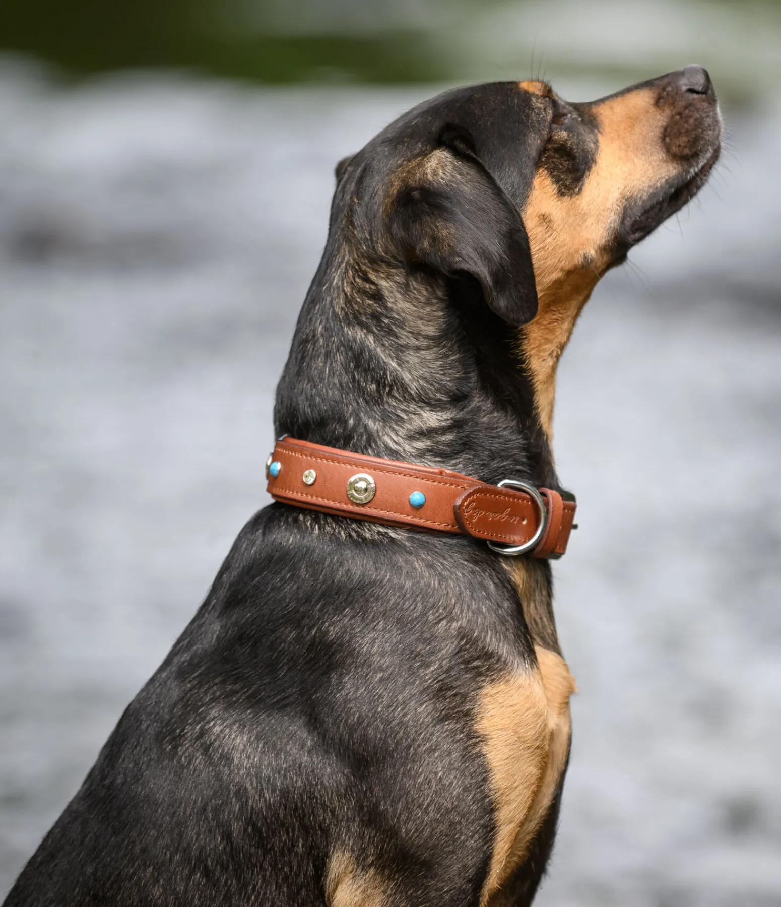 Collier en cuir véritable de grande qualité. Doublure douce pour confort optimal. Différents rivets décoratifs pour un look original. Facile à ajuster grâce à la boucle. Bouclerie argentée.