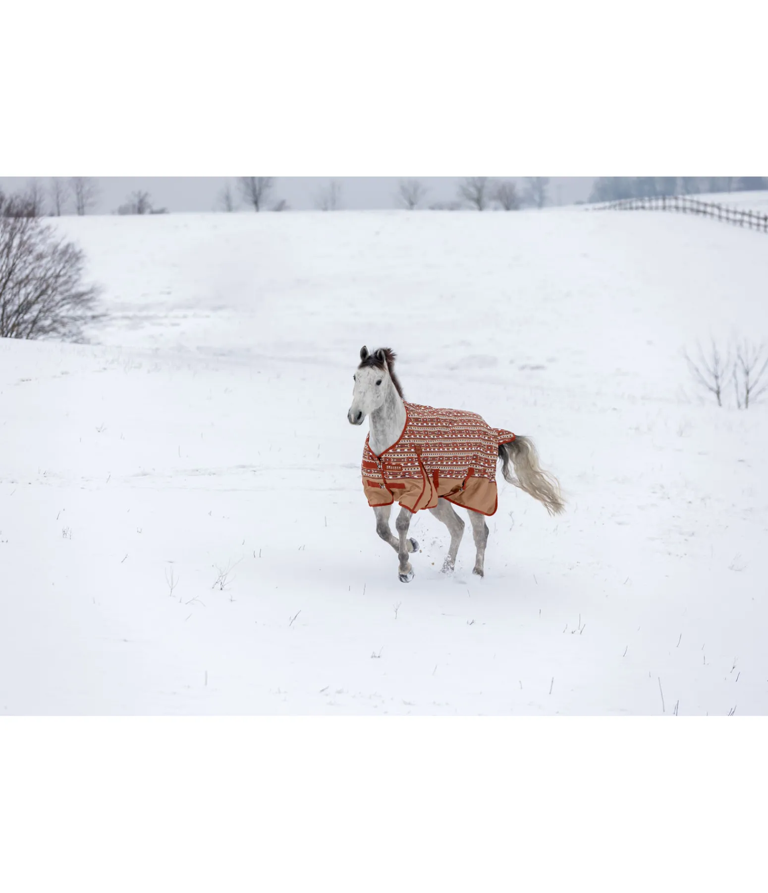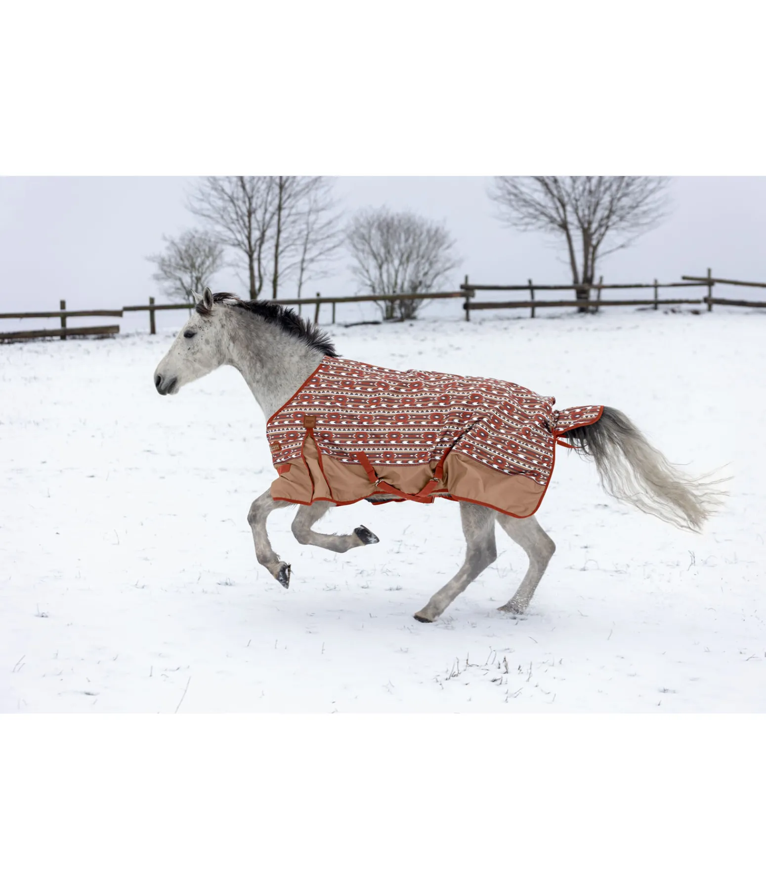 Couverture imperméable sans grammage de type western. Imperméable (3.000 mm) et respirante. Plis d’aisance pour une liberté de mouvement optimale. Double fermeture de poitrail avec crochets en T et patte auto-agrippante, sursangles croisées réglables et rabat de queue. Dispositif permettant la fixation des courroies de cuisses. Courroie de queue réglable en longueur. Doublure intérieure lisse et agréable au toucher. 100 % polyester.