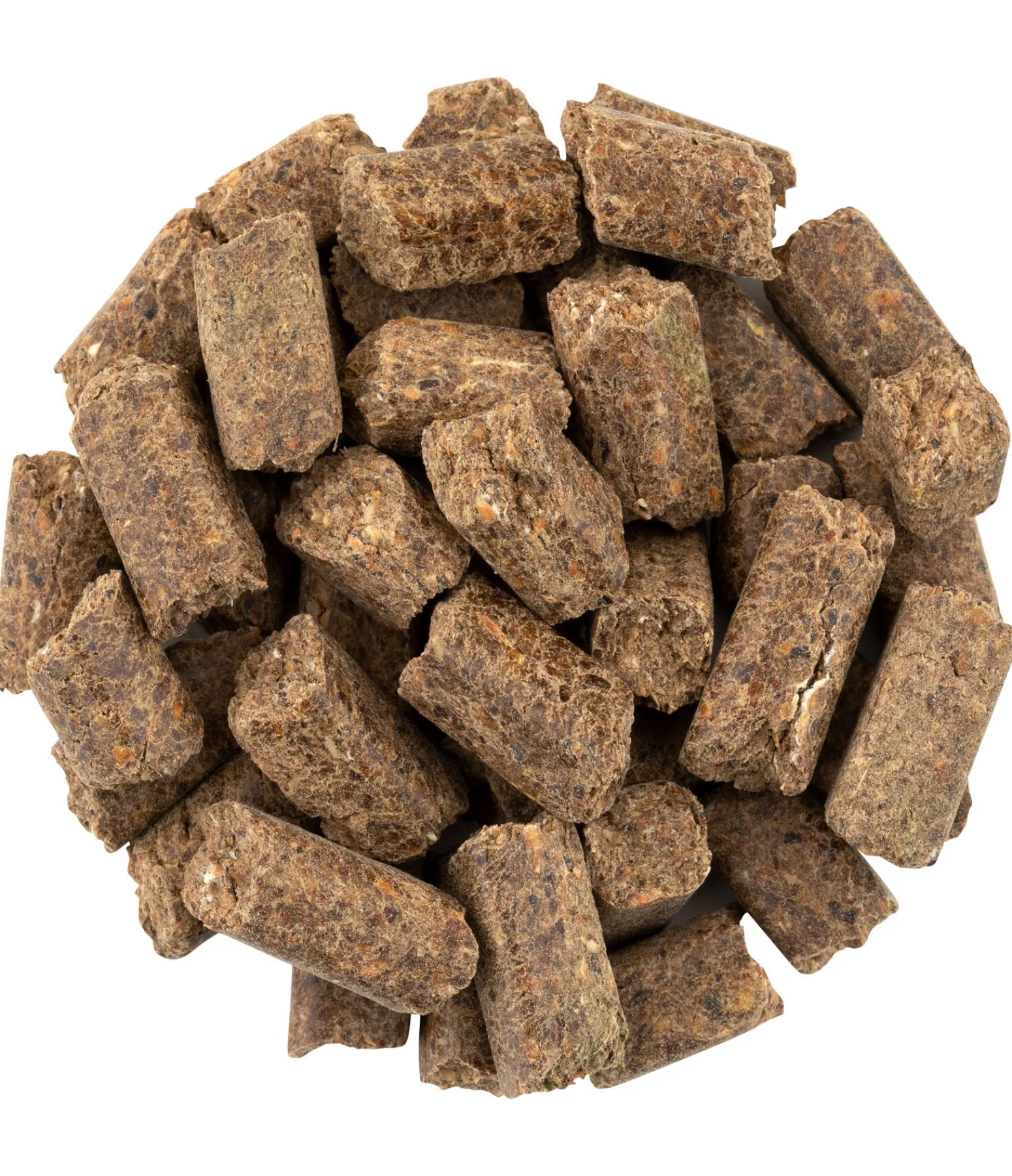 Composition : marc de pommes, pulpe de carottes, amidon de pois, farine de banane, 5 % cynorrhodons (séchés), 3,5 % kieselgur, chlorure de sodium, propionate de calcium.