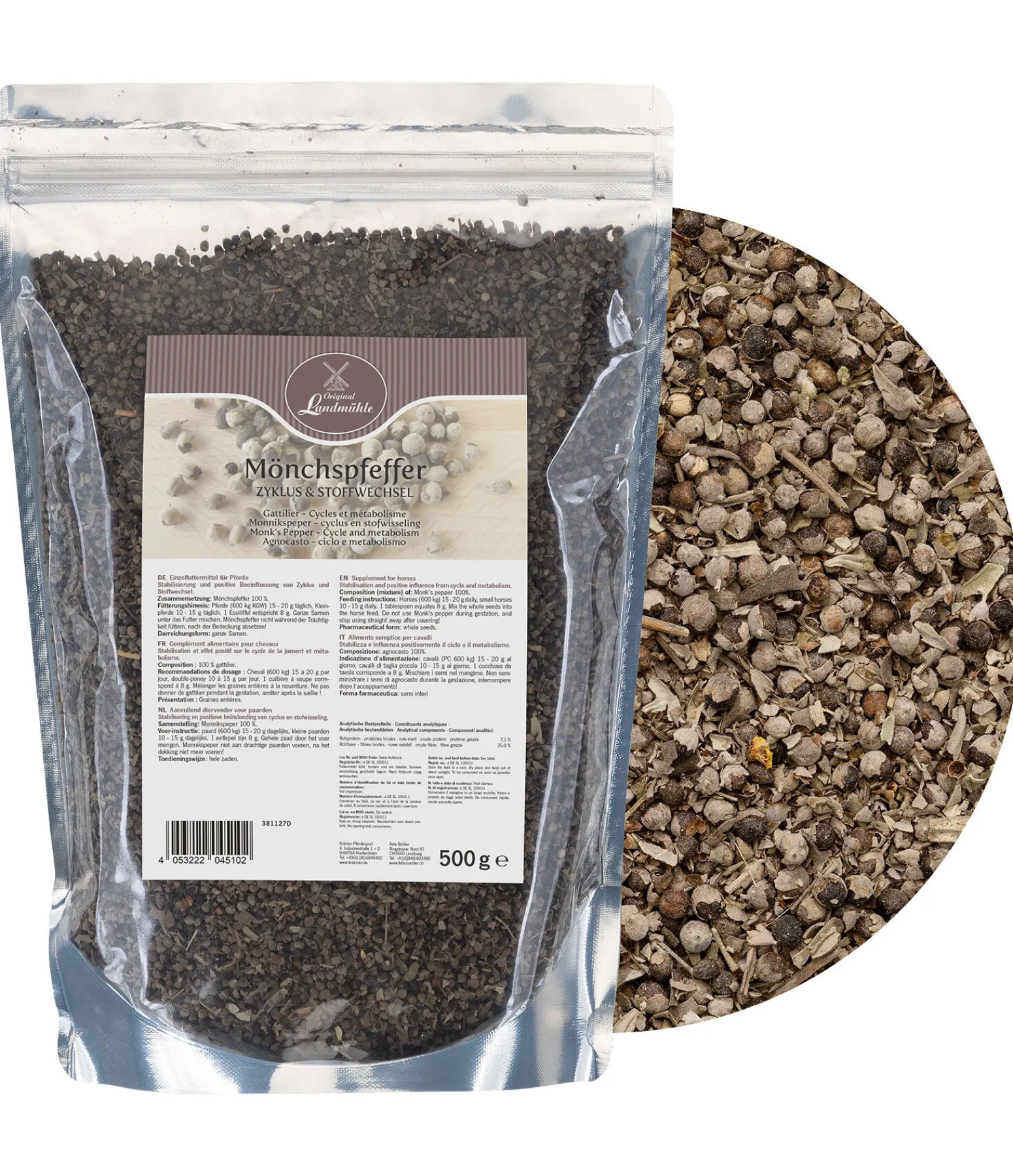 Recommandations de dosage : cheval (600 kg) 15 à 20 g par jour, double-poney 10 à 15 g par jour. 1 cuillère à soupe corespond à env. 8 g. Graines entières à mélanger à la ration. Ne pas administer de gattilier pendant la gestation, arrêter dès la saillie !