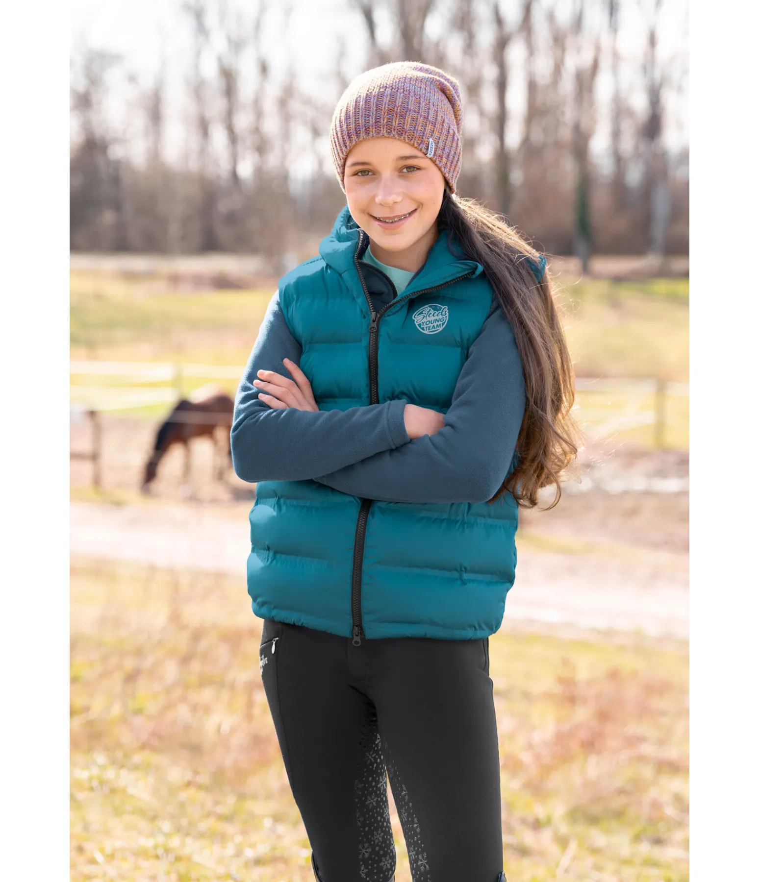 Gilet d’équitation matelassé sportswear avec col montant et capuche. Fermeture à glissière de couleur contrastante avec protège-menton. 2 poches avant avec boutons-pression. Ourlet élastiqué. Imprimé STEEDS réfléchissant sur la poitrine. Surpiqûres thermosoudées. 100 % polyester.