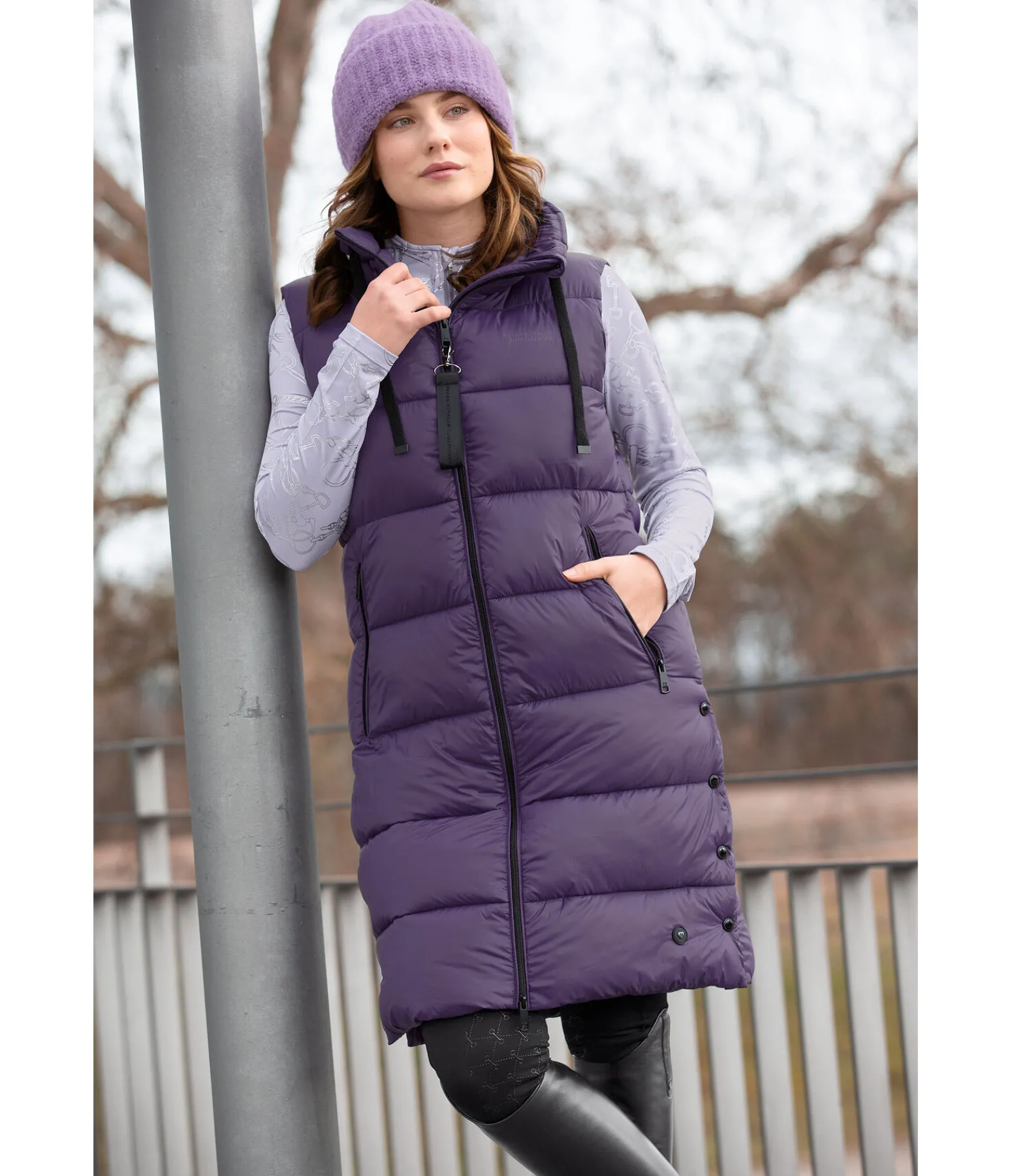 Gilet d’équitation long et matelassé. Col montant ajustable par cordon de serrage. Garnissage chaud imitation duvet. Fermeture à glissière bidirectionnelle avec sous-patte et protège-menton. 2 poches avant zippées. Taille réglable. Badge en forme de coeur sur l’ourlet. Logo siliconé sur la poitrine. 2 fentes cavalières latérales avec boutons-pression et 1 fente cavalière zippée à l’arrière. 100 % nylon.
