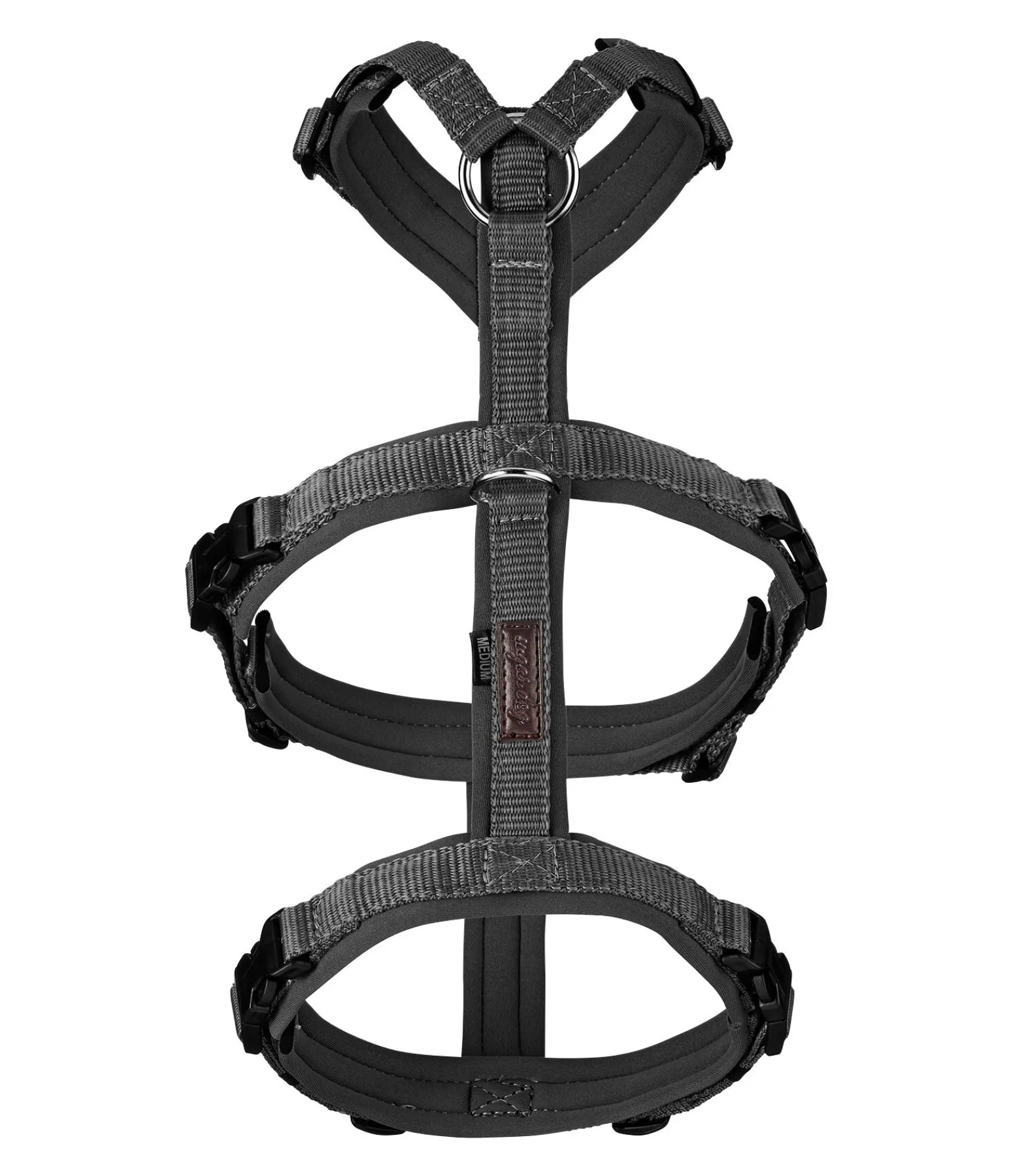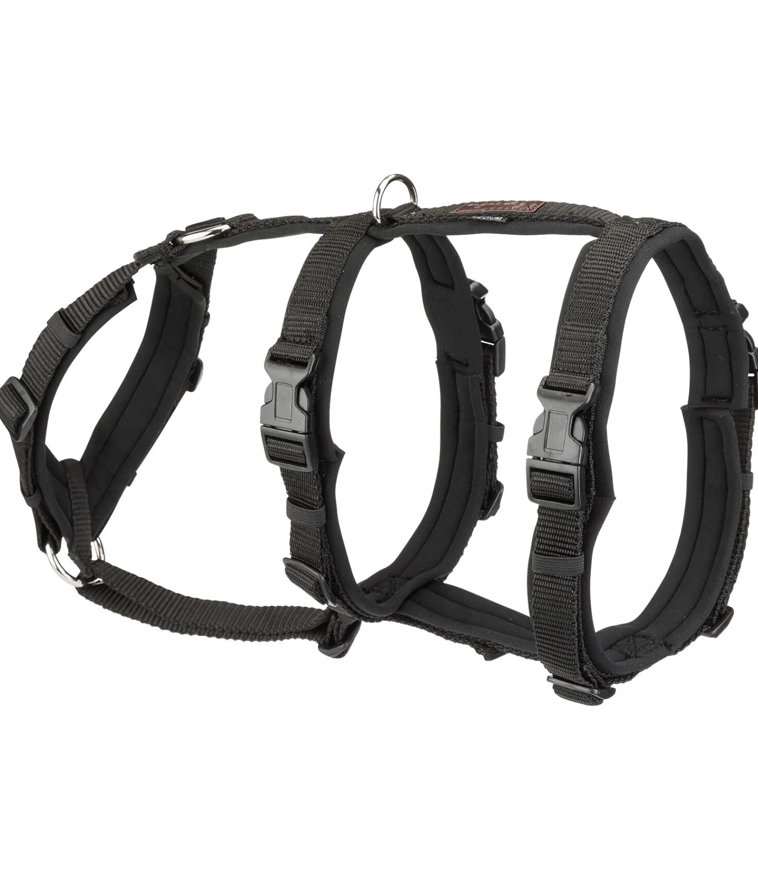 Harnais de sécurité anti-fugue doté de trois sangles réglables. Idéal pour les chiens peureux et sensibles qui ont tendance à s’enfuir face à des situations inhabituelles. Pour ajuster de manière optimale le harnais à la morphologie du chien, les trois sangles peuvent être réglées en longueur sur chaque côté. Le harnais dispose d’un rembourrage doux pour plus de confort. La lanière sur le poitrail peut être réglée en longueur afin d’adapter le harnais aux chiens de grande taille. La laisse peut être fixée sur l’anneau en D sur le dos ou sur l’anneau situé au niveau du poitrail. Largeur de la sangle, rembourrage inclus, env. 3 cm. Sangle 100 % polypropylène, rembourrage 100 % caoutchouc chloroprène.