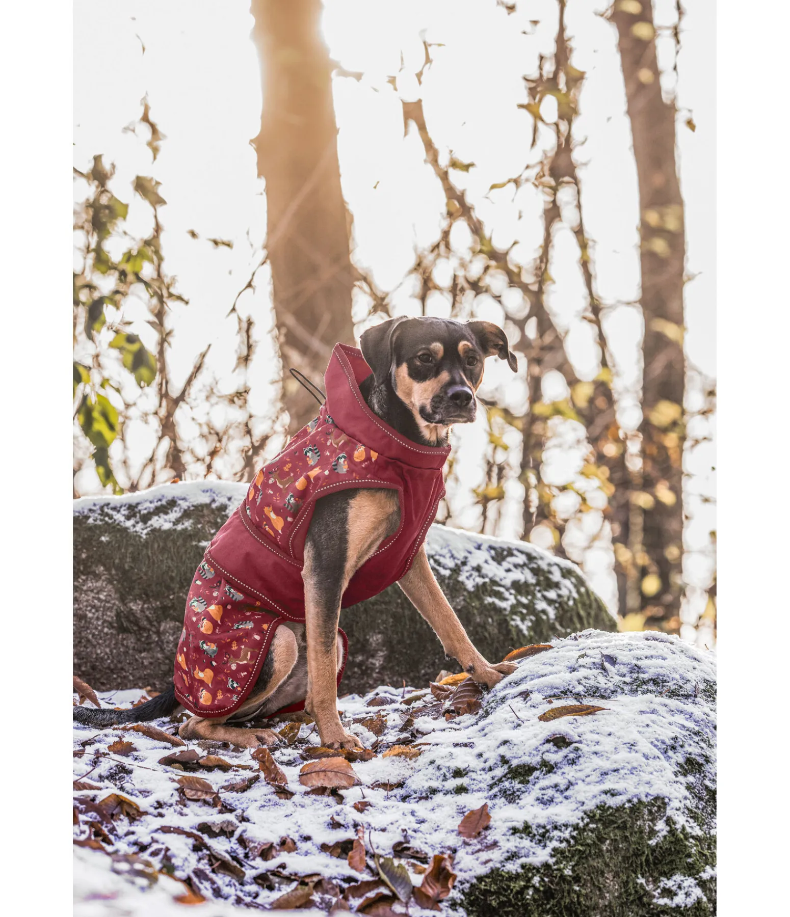 Manteau imperméable (3.000 mm), respirant (3.000 g/m2/24h) et coloré avec motifs automnaux et liseré réfléchissant. Idéal pour les journées d’automne humides et froides. Dessus en polyester Oxford 600 deniers robuste et résistant à la déchirure. Réglable au cou par cordon de serrage et au poitrail par patte auto-agrippante à fermer dans le dos pour le meilleur ajustement. Passage de laisse zippé étanche dans le dos et passage de collier au col. Des courroies de cuisses dissimulées permettent d’éviter que le manteau ne glisse lorsque le chien s’amuse, sans pour autant le gêner. Découpe au niveau des épaules pour une plus grande liberté de mouvement. 100 % polyester.
