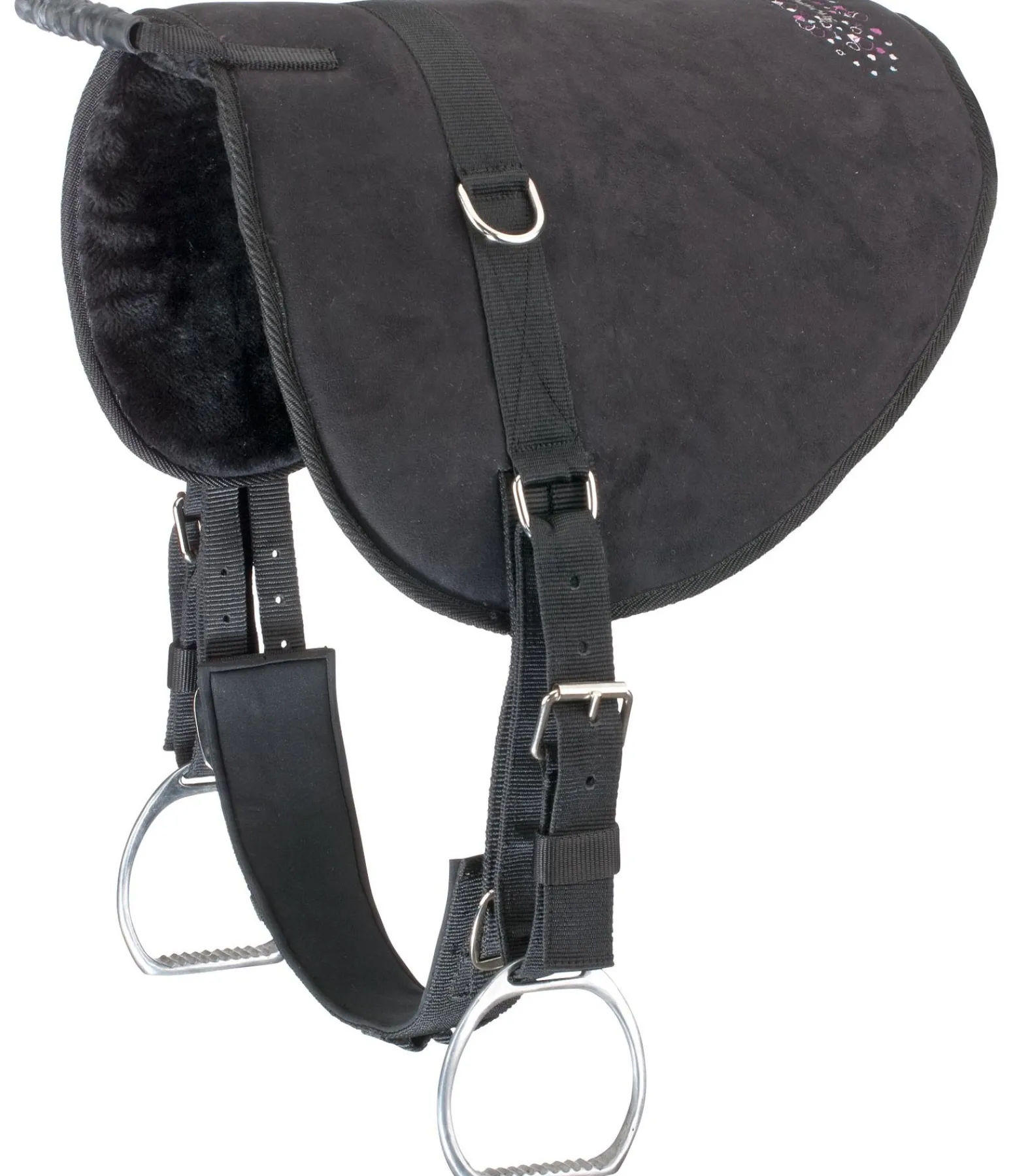 Kit avec bardette pratique pour enfants avec adorable broderie décorative. Bardette résistante avec dessus en suédine antidérapante et dessous en polaire Teddy moelleuse rendant l’utilisation d’un tapis de selle superflue. Avec poignée, étrivières, étriers (largeur du plancher 7,5 cm) et sangle (longueur 40 cm). Anneaux supplémentaires pour fixer un enrênement ou d’autres étrivières. Compatible avec d’autres sangles et étriers.