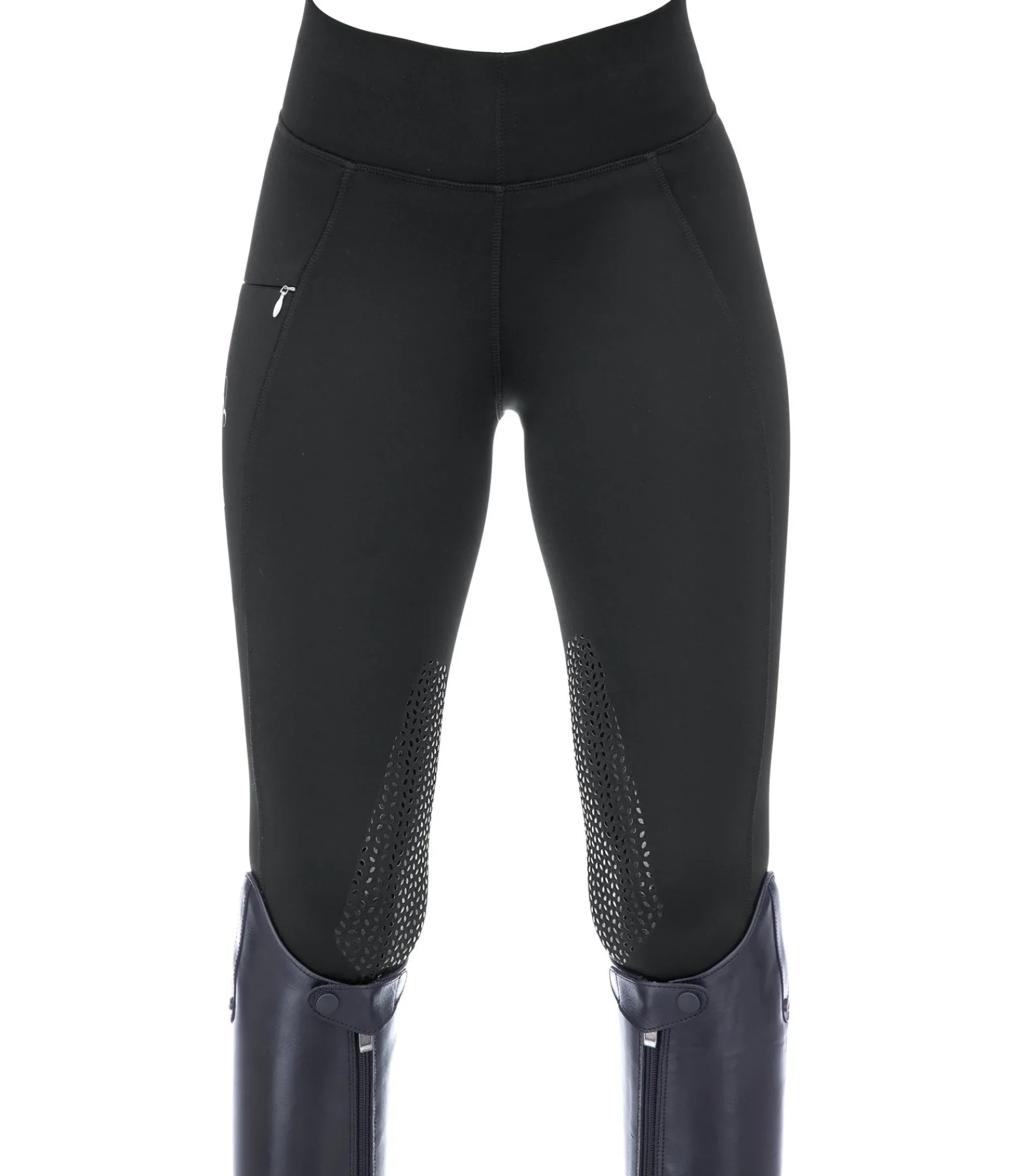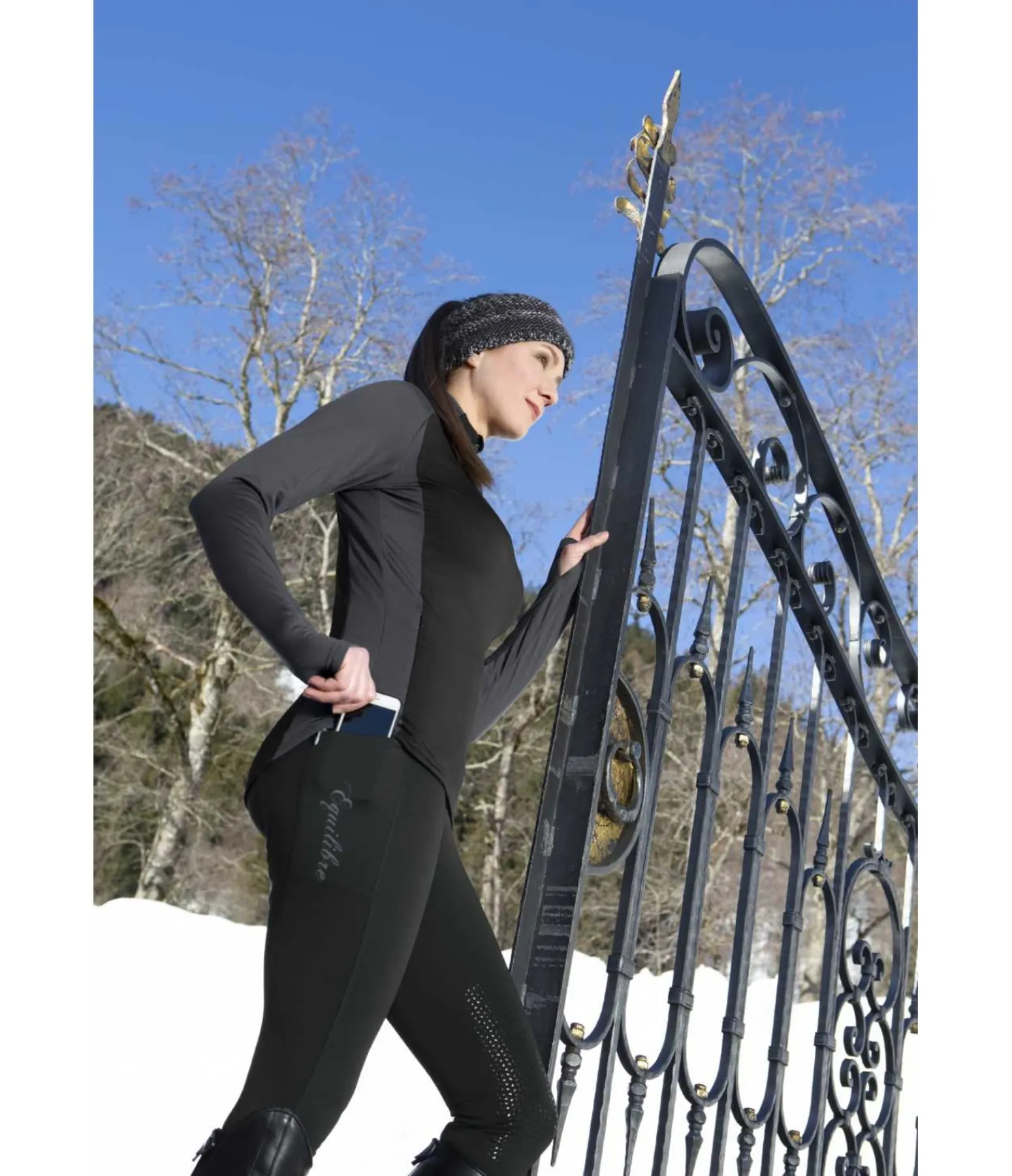Legging d’équitation avec basanes en silicone. Matière extensible, lisse à l’extérieur et molletonnée à l’intérieur. Ceinture extra large élastiquée. Poche zippée pour téléphone portable sur la cuisse. Bas de jambe extensible sans patte auto-agrippante. 86% polyester, 14% élasthanne.