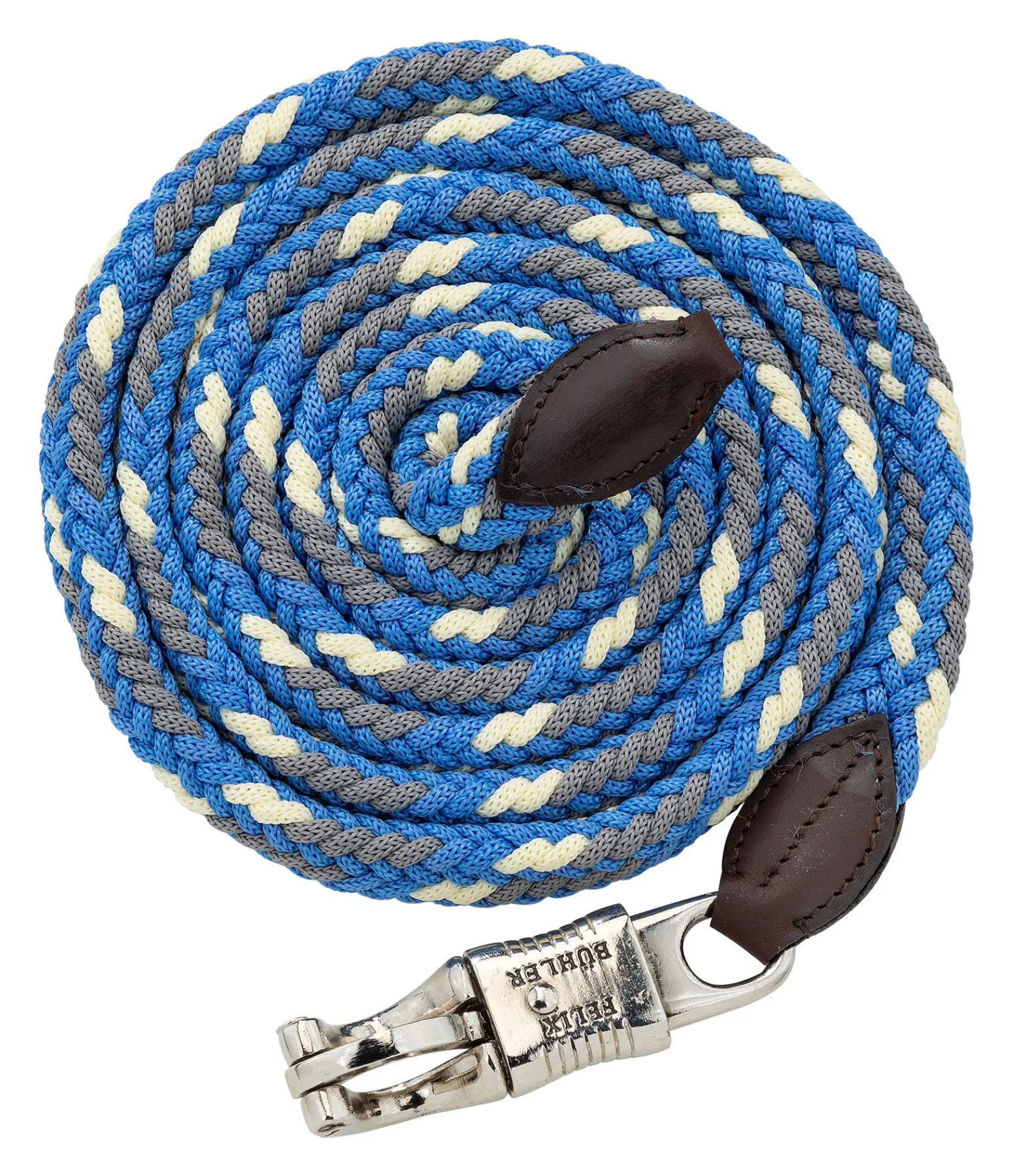 Longe tressée très résistante avec élégants embouts en cuir et mousqueton anti-panique. Assortie au licol 310040. Bouclerie argentée. 2 m. 100 % polypropylène.