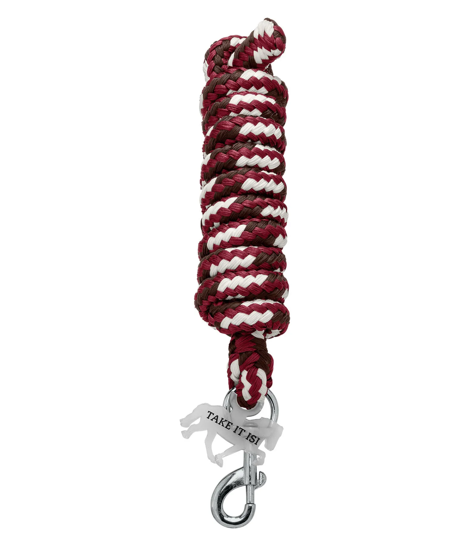 Longe longue avec mousqueton tressée de plusieurs couleurs. Médaillon en caoutchouc avec logo. Bouclerie argentée. 100 % polyester.