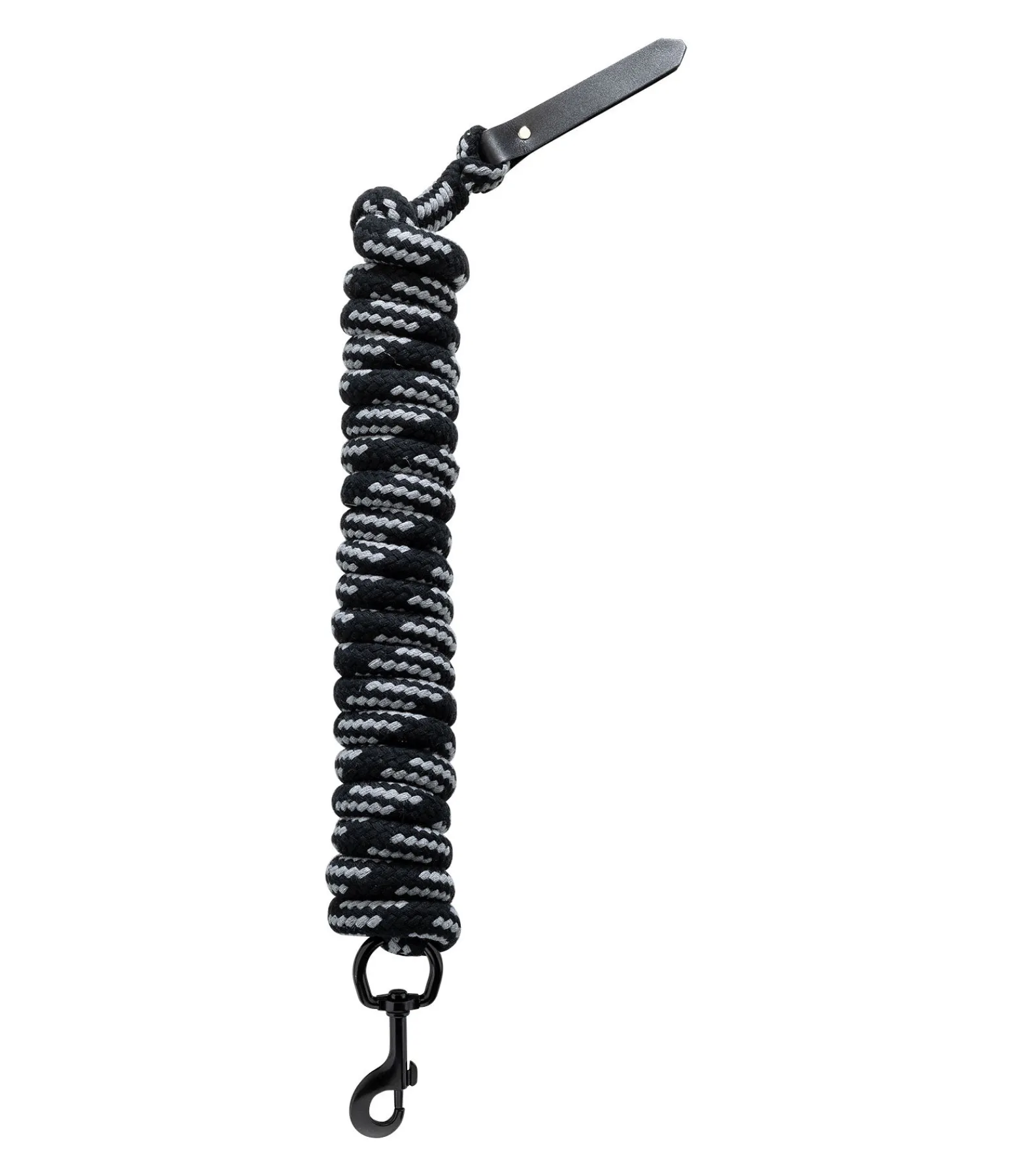 Coeur en polyester lourd, gaine en coton. Ne brûle pas la main si le cheval s’emballe. Diamètre 20 mm. Avec claquette en cuir et mousqueton Bolt Snap en laiton. Disponible en 4 ou 7 mètres.