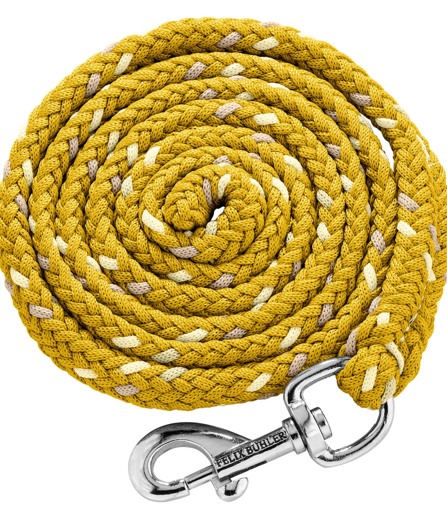 Longe tressée tricolore solide avec mousqueton. 2 m. 100 % polyester. Assortie au licol 310057.