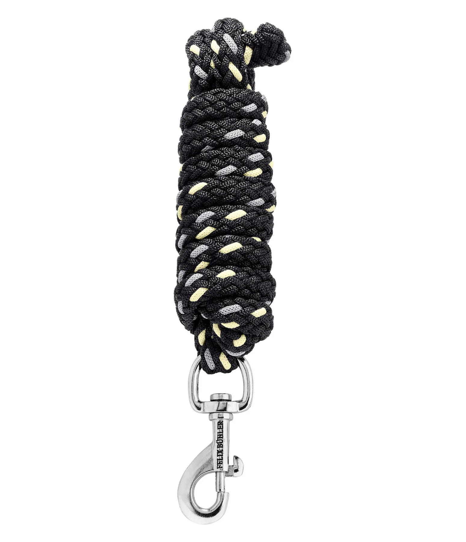 Longe tressée tricolore solide avec mousqueton. 2 m. 100 % polyester. Assortie au licol 310057.