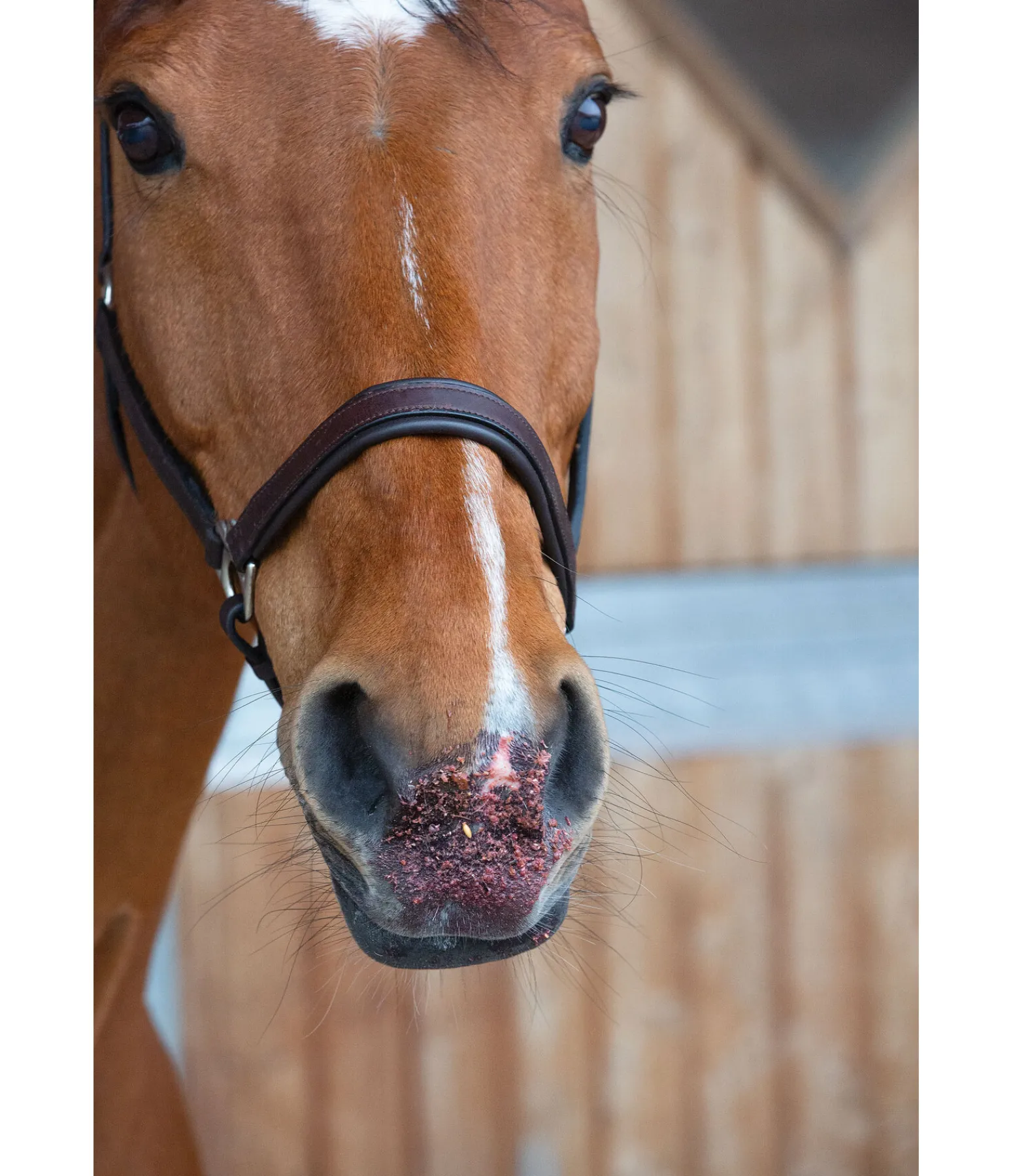 Composition : son de blé, orge (aplatie), avoine noire, grains de maïs (aplatis), tourteau de lin, 6.58 % de marc de pomme, 3 % de betterave rouge (séchée), mélasse de betterave sucrière, 2 % de mélange de fruits (25 % de dés de pommes, 25 % de dés de carottes, 20 % de chips de bananes, 15 % de dés de betteraves rouges, 15 % de cynorrhodon), levure de bière. *La recette contenant un prémix, le total fait plus de 100 %.