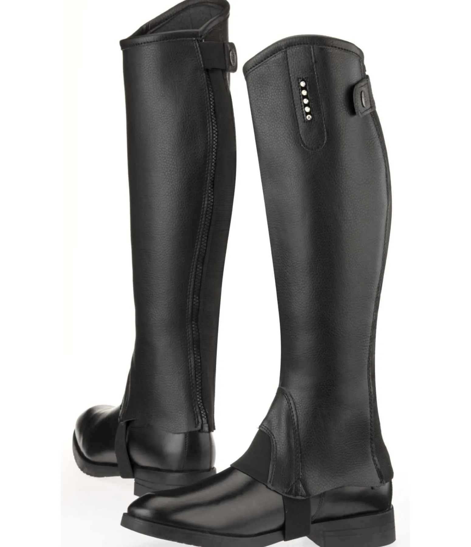 Élégantes mini-chaps d’hiver ornées de strass. Doublure en polaire pour garder les jambes bien au chaud. Matière extérieure synthétique aspect grainé. Empiècement élastique le long de la fermeture à glissière YKK résistante sur la partie arrière pour une adaptation parfaite au mollet.