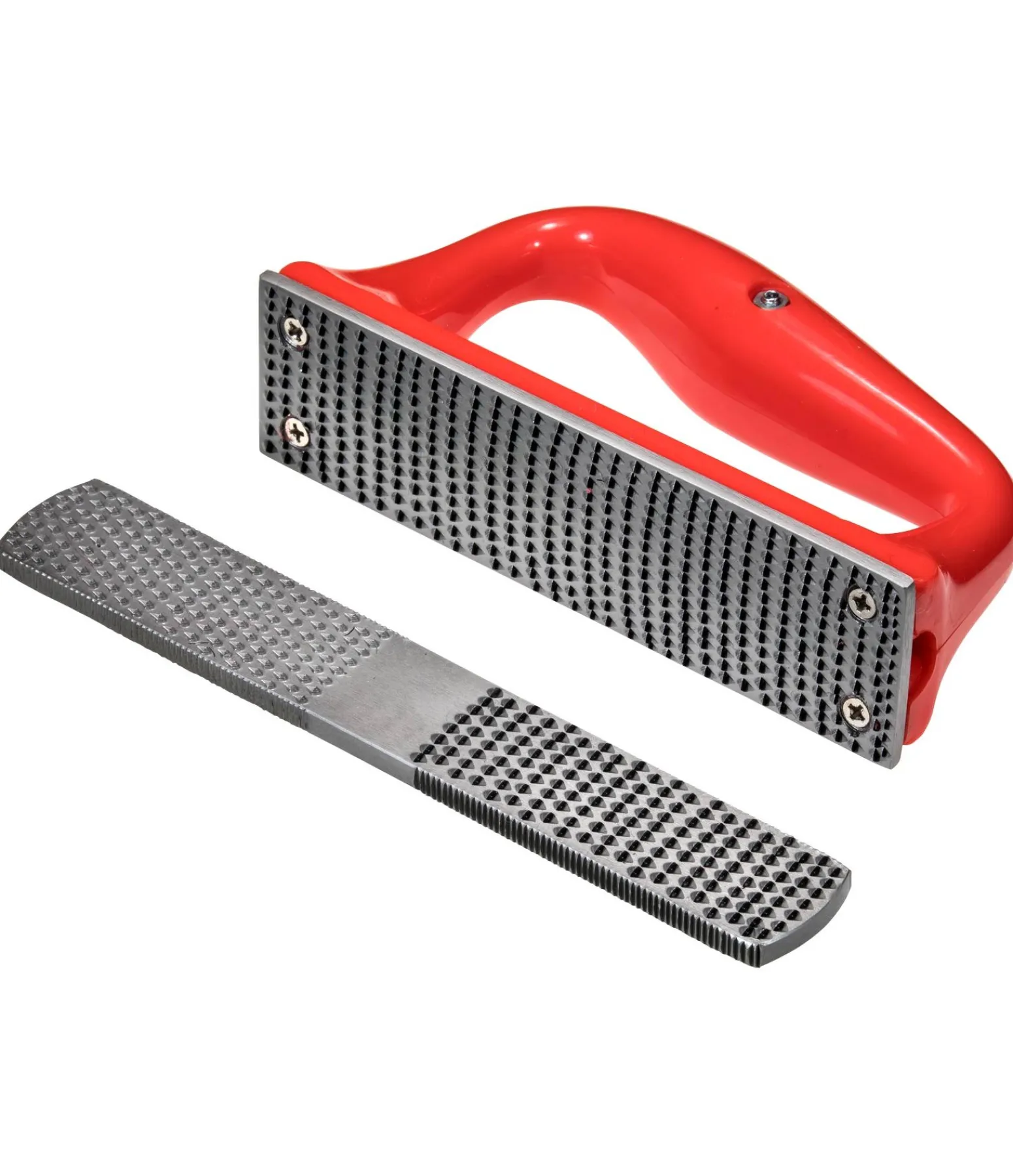 Ensemble pratique de parage incluant 2 pièces : une râpe à sabot avec manche ergonomique en PVC et une mini-râpe à sabots. Idéal pour les petites rectifications ainsi que le parage des sabots de poneys. 12,5 x 3 cm (avec manche) et 15,5 x 2,5 cm (sans manche).