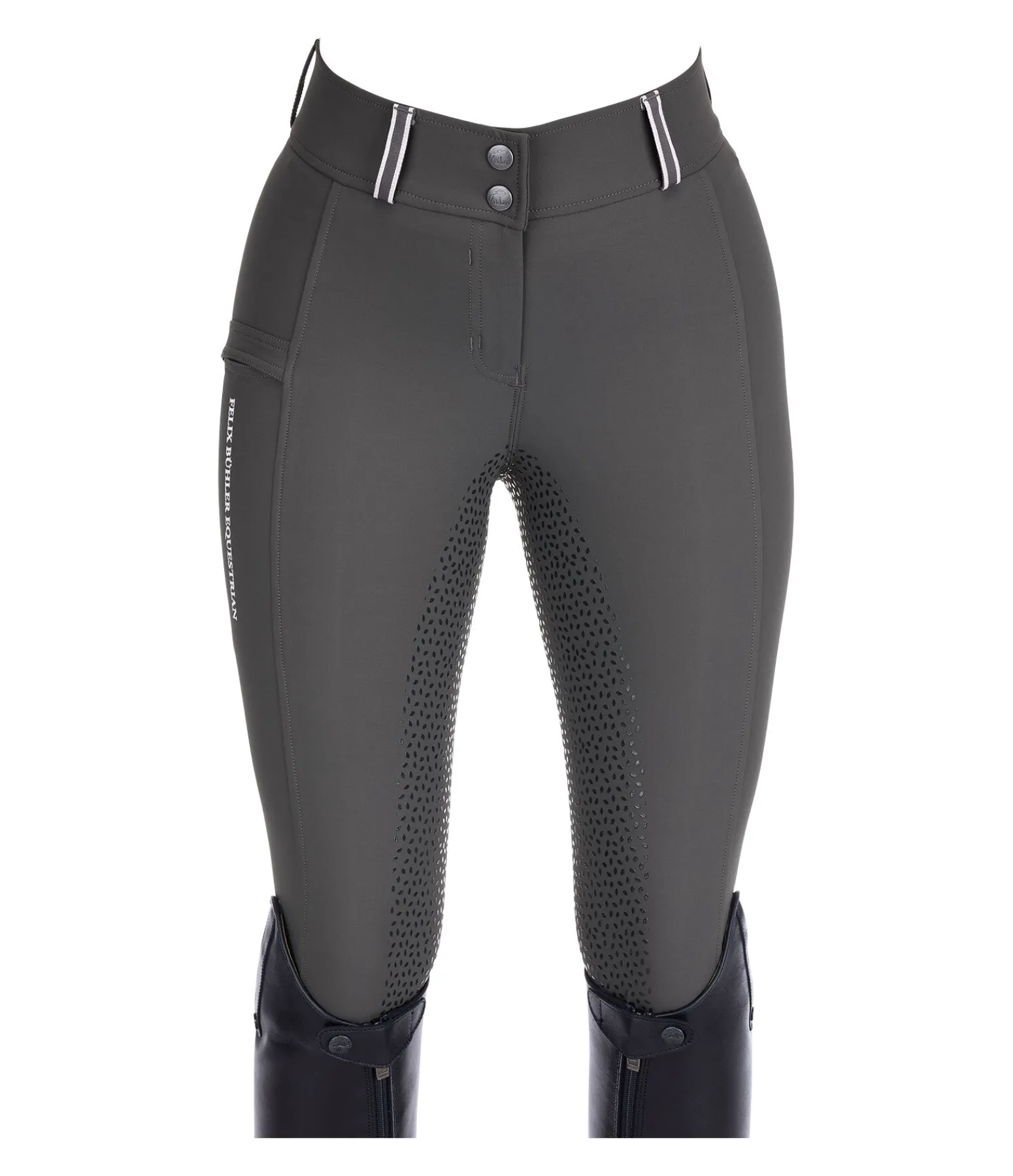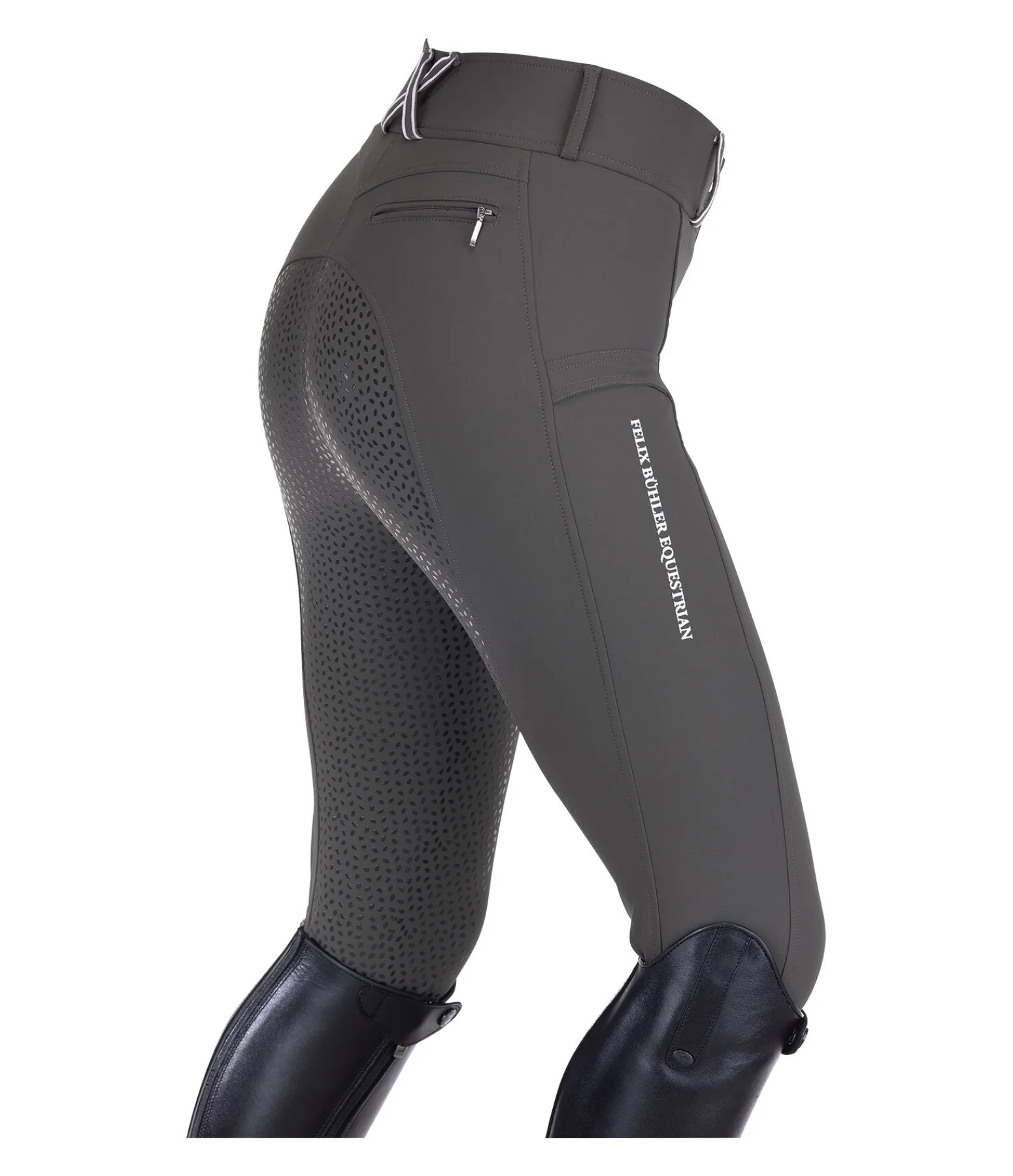 Pantalon d’équitation technique avec fond intégral grip en silicone. Matière déperlante, respirante à séchage rapide. Le tissu stretch offre un super confort et une assise parfaite. 1 poche arrière zippée, 1 poche pour téléphone portable sur la jambe. Ceinture élastiquée avec passants rayés de couleur contrastante. Aucune couture au niveau des genoux. Bas de jambe extensible en stretch. 89 % nylon,11 % élasthanne.