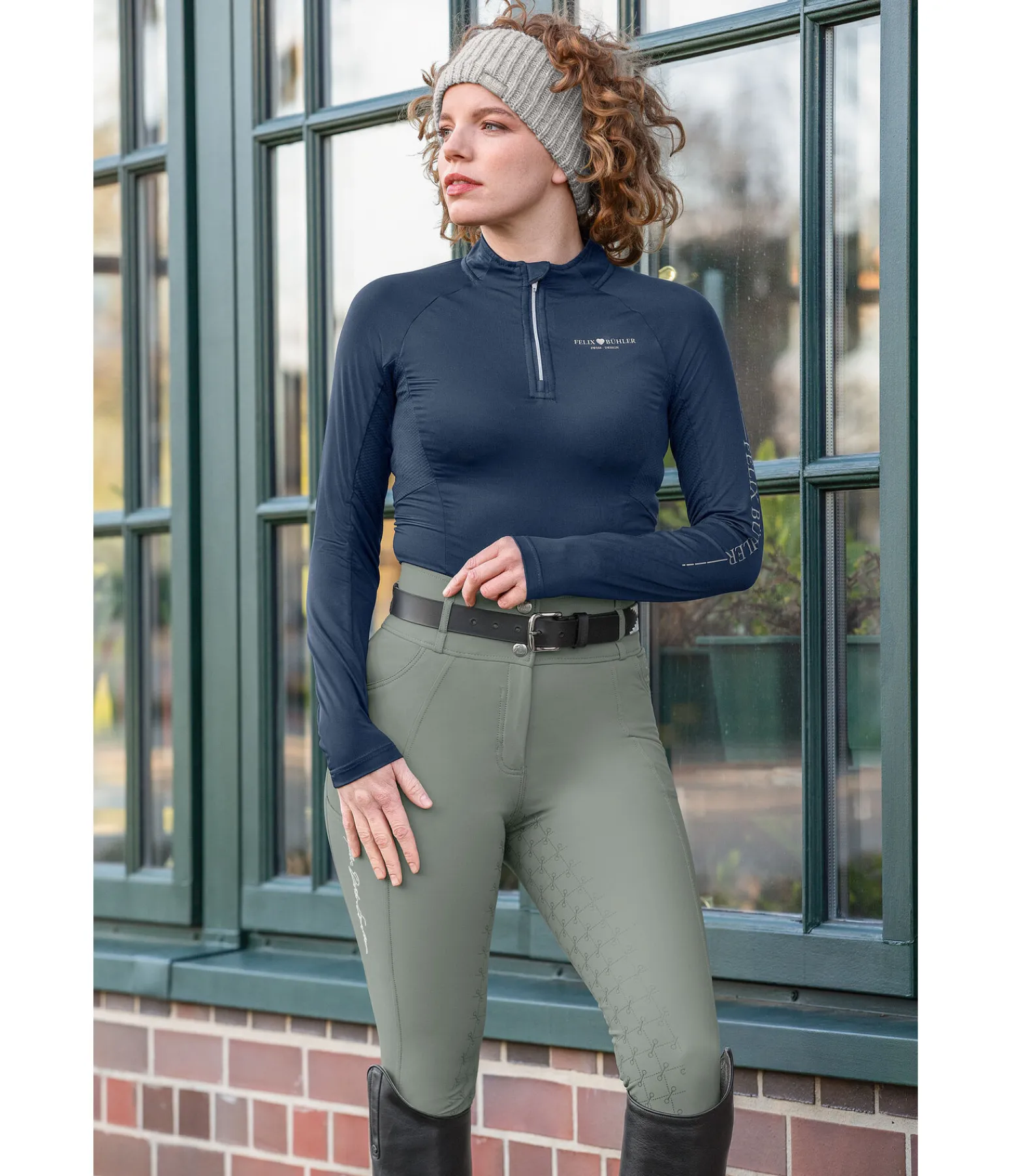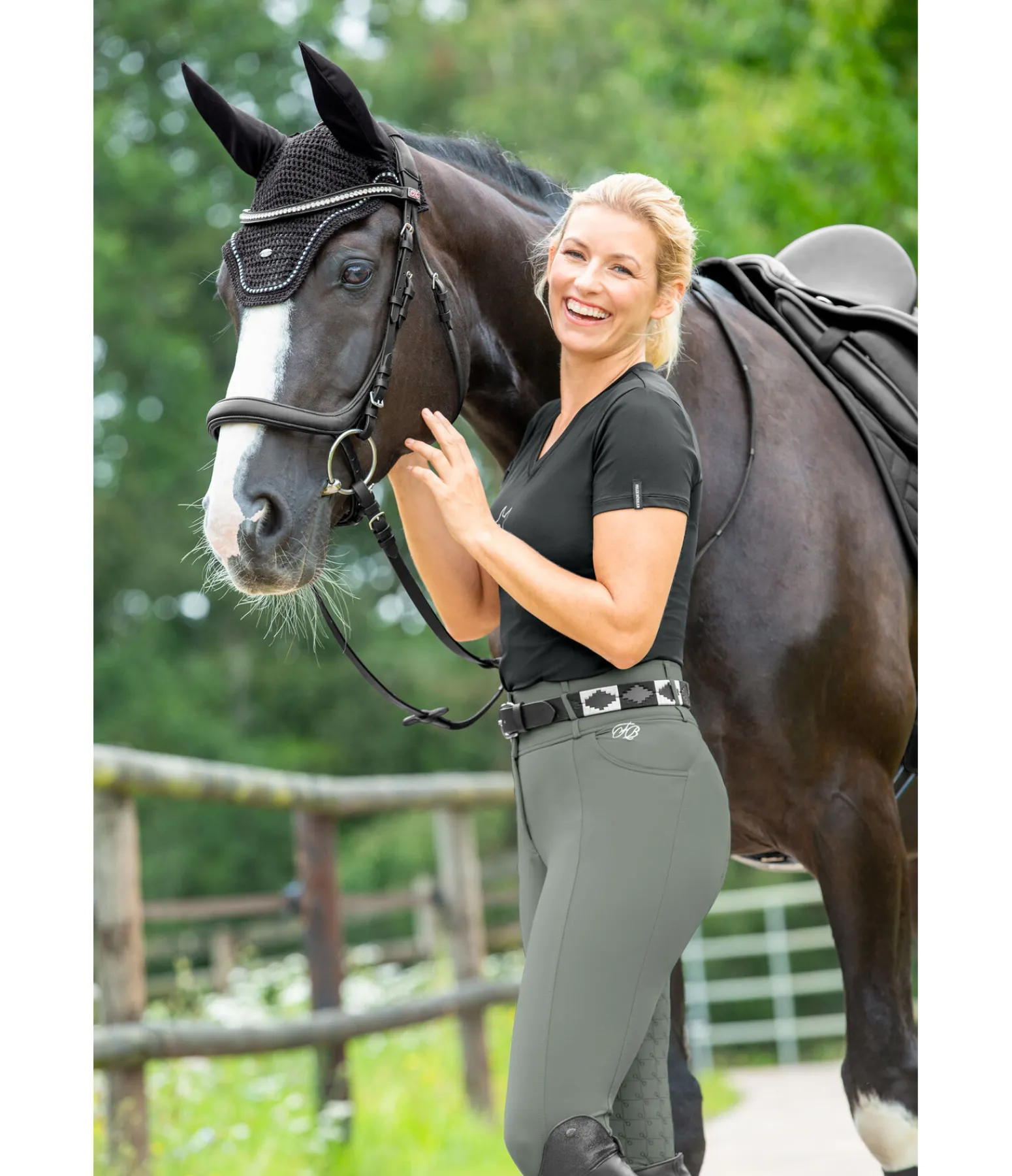 Pantalon d’équitation sportswear et extensible, à fond intégral grip en silicone avec motifs de mors. Matière déperlante, respirante et à séchage rapide. Broderie Felix Bühler sur la jambe. Poche arrière zippée et poche pour téléphone portable sur la cuisse. Deux poches avant. Ceinture à passants extra large élastiquée avec 2 boutons. Aucune couture aux genoux. Bas de jambe extensible en stretch. 89 % nylon, 11 % élasthanne.