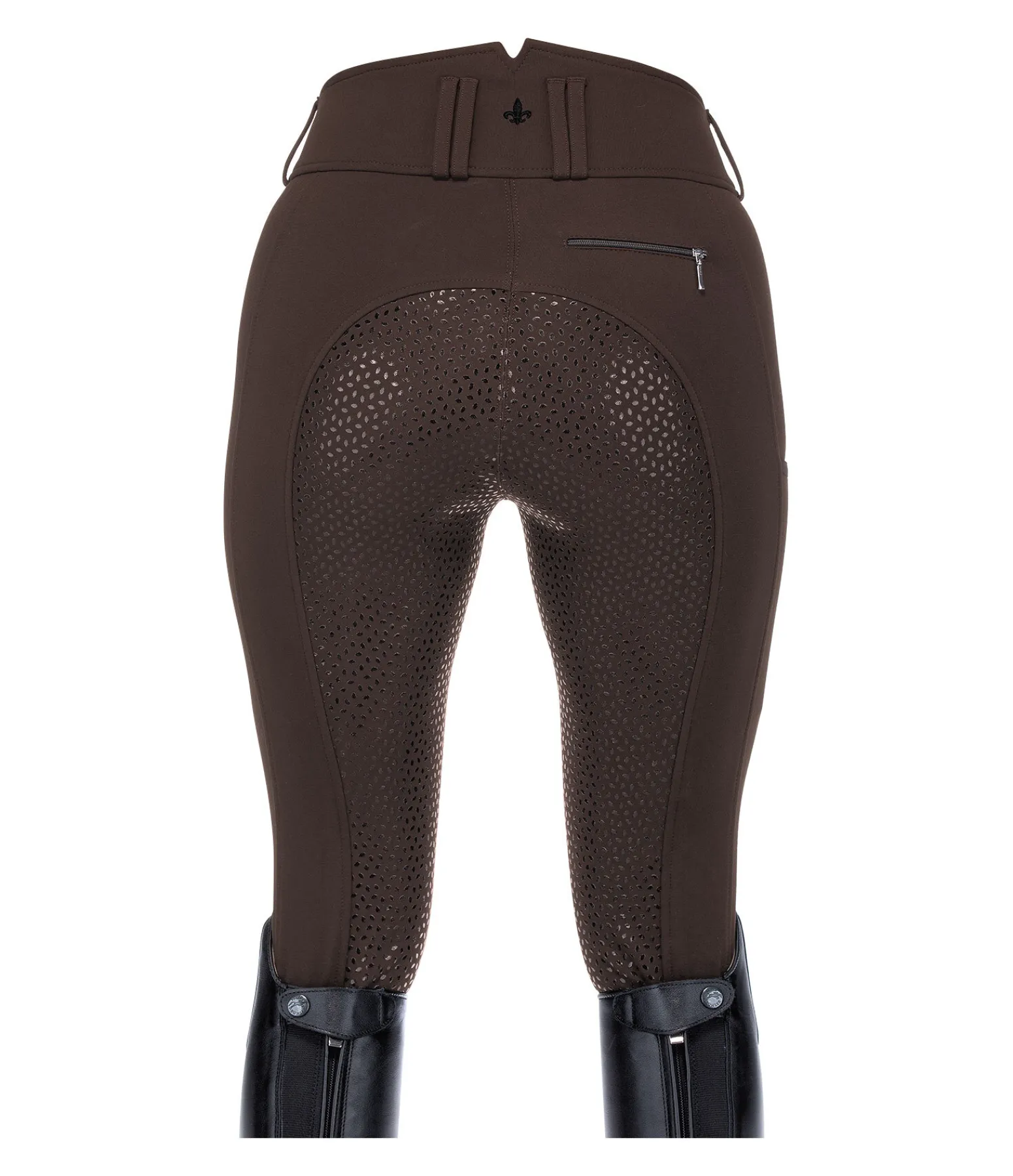 Pantalon d’équitation taille haute. Matière souple super confortable et extensible. Fond intégral grip en silicone. Aucune couture au niveau des genoux. Une poche latérale pour téléphone portable et une poche arrière zippée. Broderie sur l’avant et l’arrière. Bas de jambe extensible sans patte auto-agrippante. 68 % viscose, 27 % nylon, 5 % élasthanne.