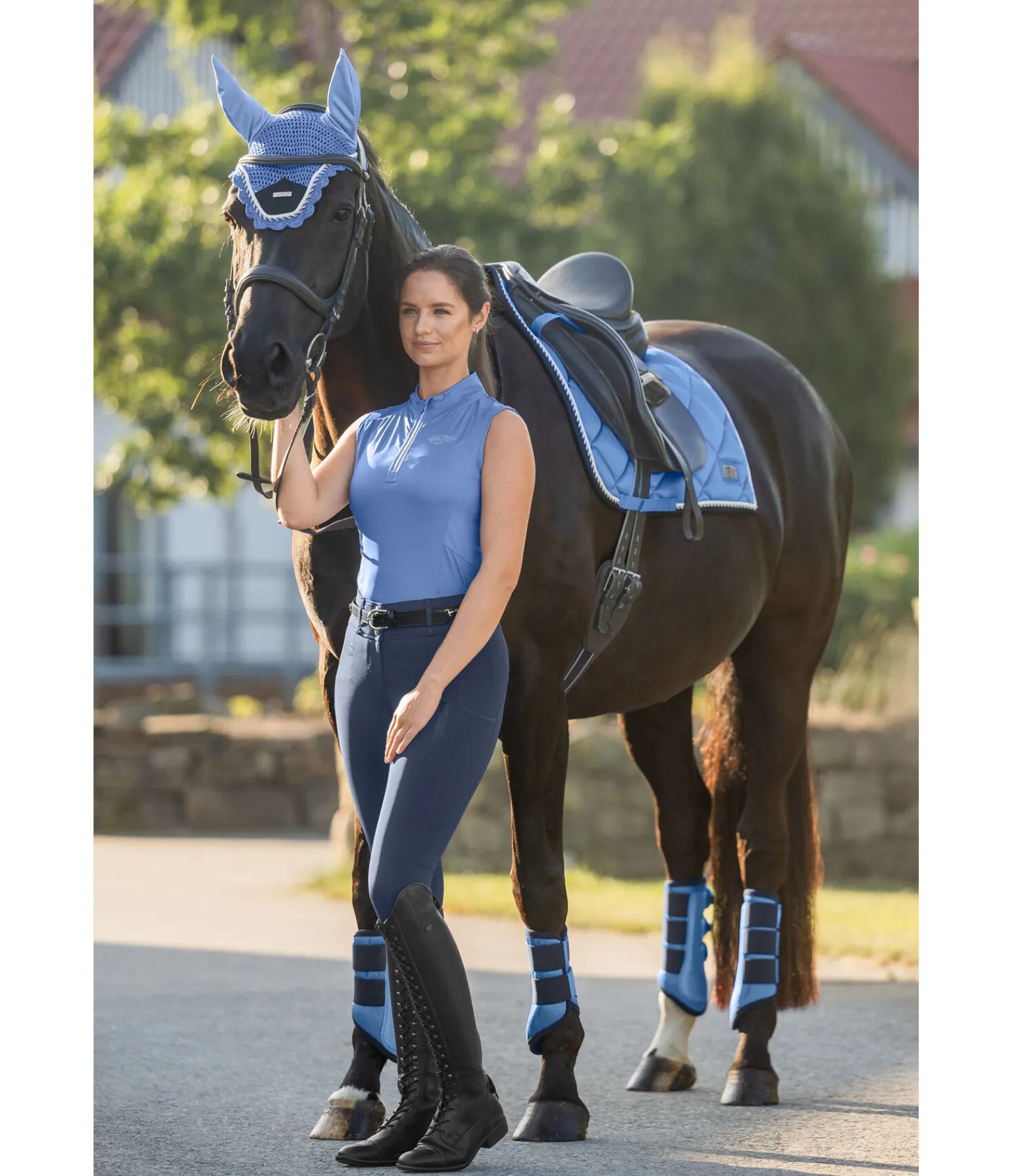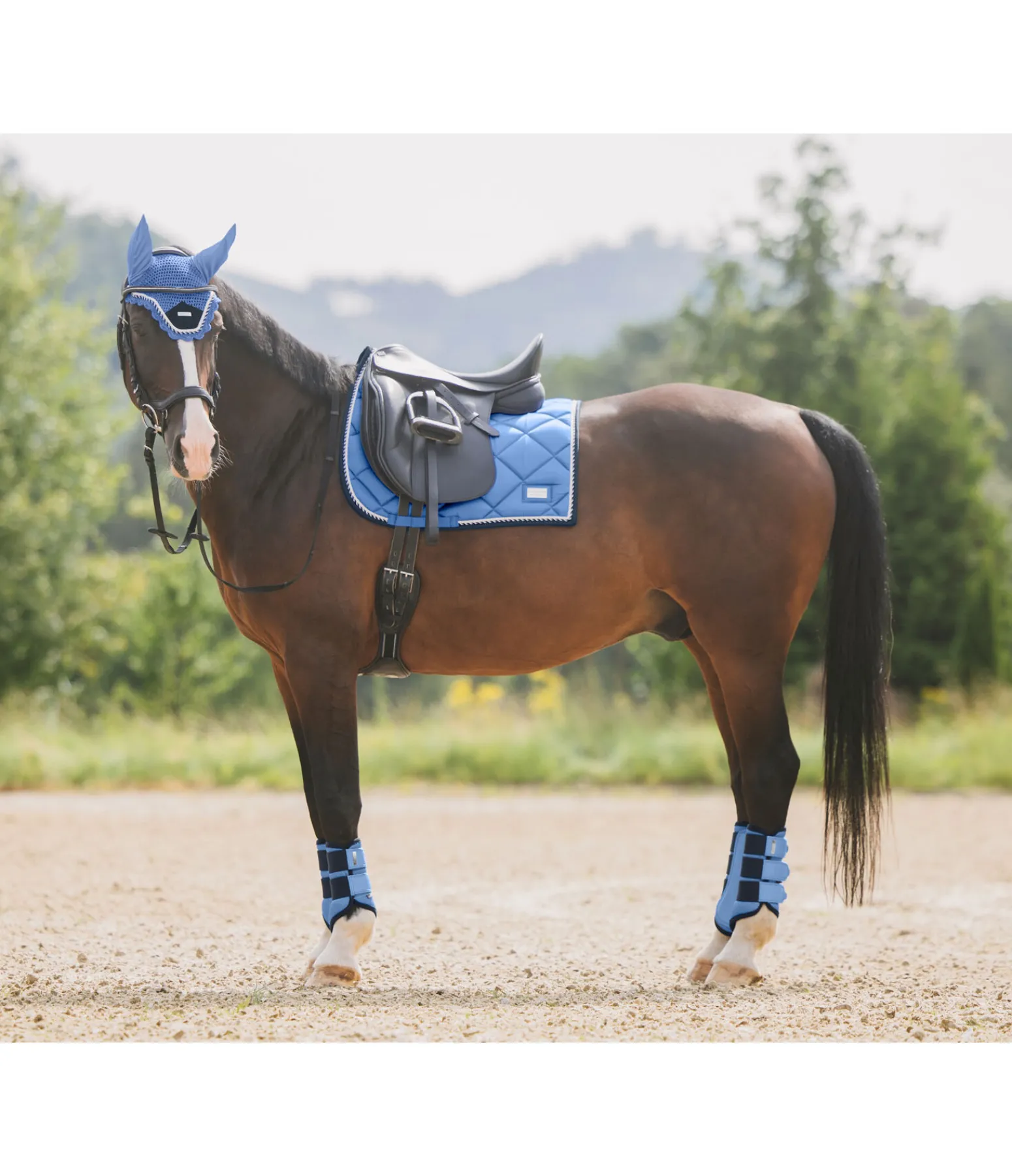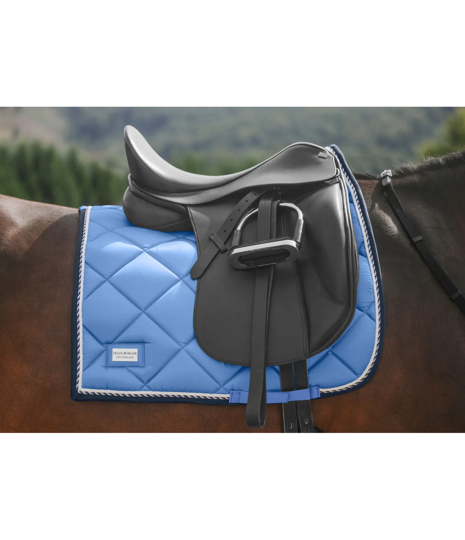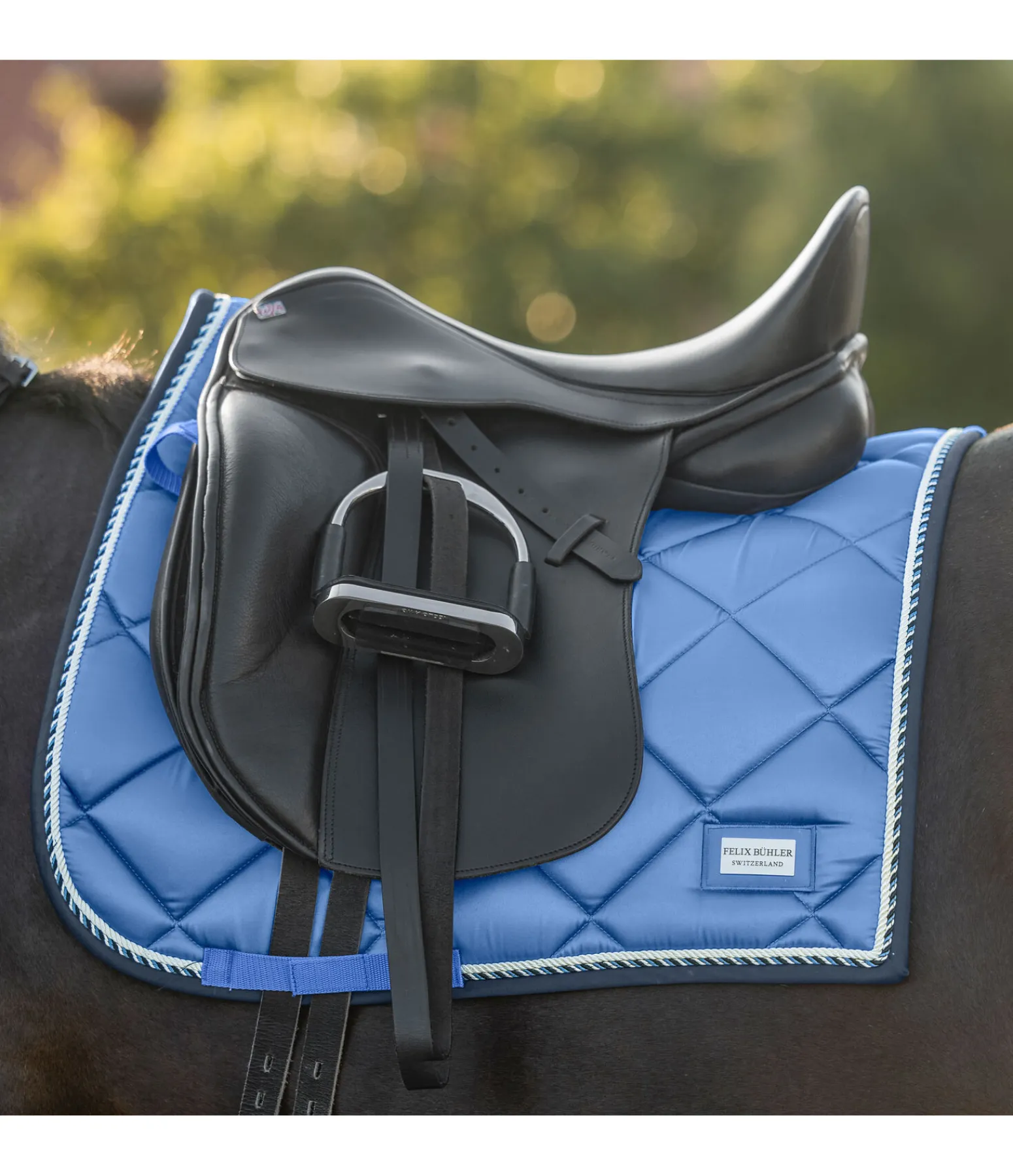 Tapis de selle de forme carrée. Petite plaque argentée avec logo. Tissu satiné. Cordons décoratifs de couleur assortie. Passants de sangle et de contre-sanglons avec patte auto-agrippante pratique. Dessous en Air mesh respirant et absorbant l’humidité. 100 % polyester.