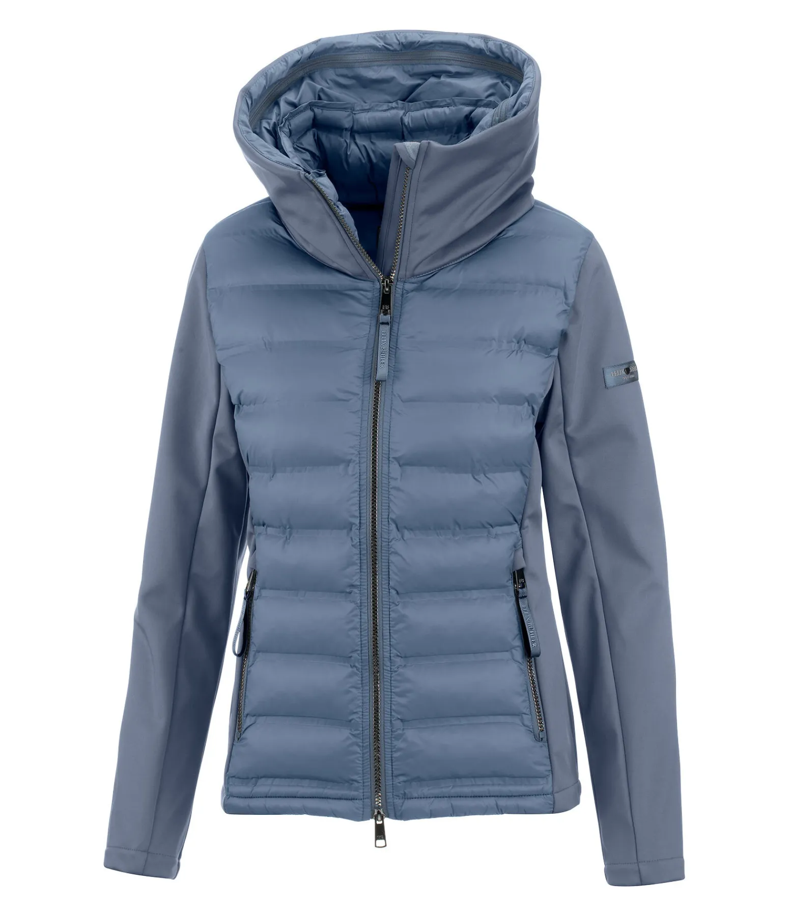 Superbe combinaison de softshell extensible et de nylon avec un garnissage très doux en imitation duvet devant et derrière. Coupe-vent. Double col et capuche rembourrée repliable dans le large col extérieur par fermeture à glissière. Coutures thermosoudées, fermeture à glissière double sens avec sous-patte et protège-menton, 2 poches zippées devant. Logo élaboré sur la manche et le col. Avant, dos, col intérieur et capuche 100 % nylon, matière softshell 92 % polyester, 8 % élasthanne.
