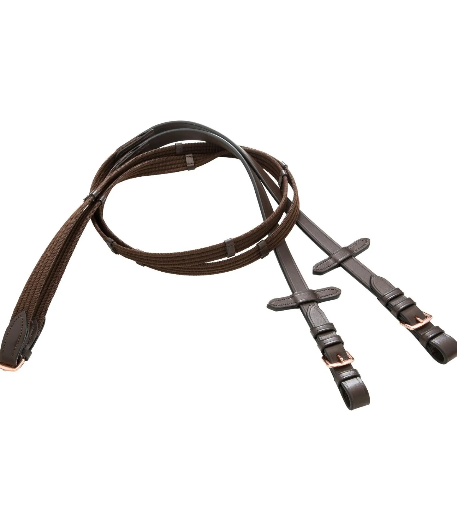Bridon exceptionnel avec muserolle française combinée et frontal vague scintillant avec pierres scintillantes argentées et rose-doré. Frontal et muserolle avec doublure douce en cuir. Bouclerie rose doré. Avec rênes sangle, sans mors.