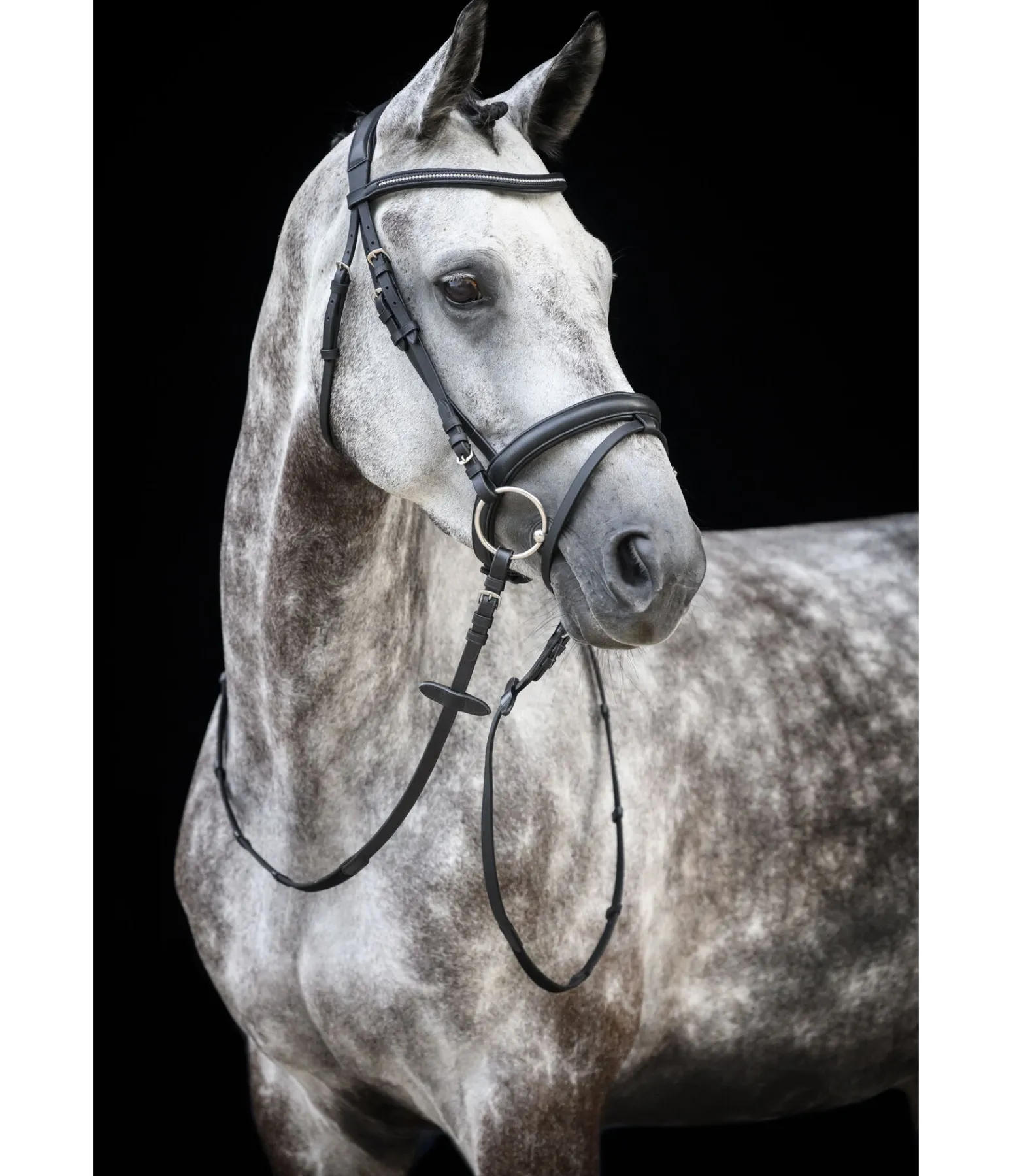 Bridon de qualité supérieure en cuir travaillé particulièrement souple et flexible. Têtière anatomique avec découpe confortable aux oreilles et large appui sur la nuque pour une répartition optimale des pressions. Frontal vague scintillant, muserolle et têtière avec doublure douce. Bridon noir avec bouclerie argentée. Avec rênes sangle, sans mors.