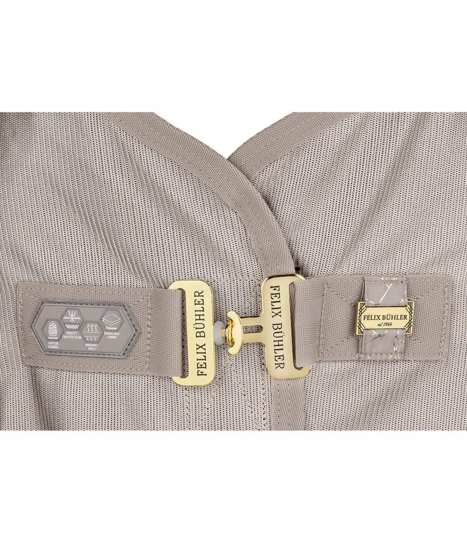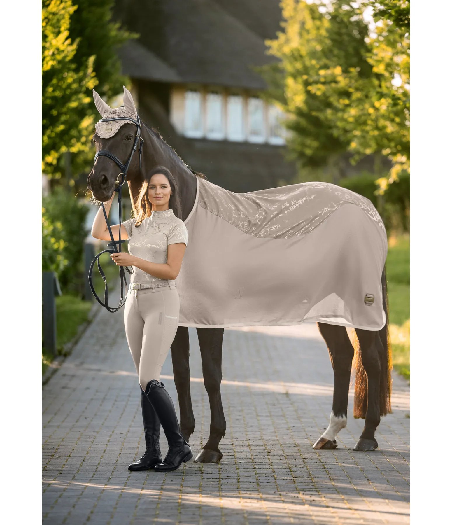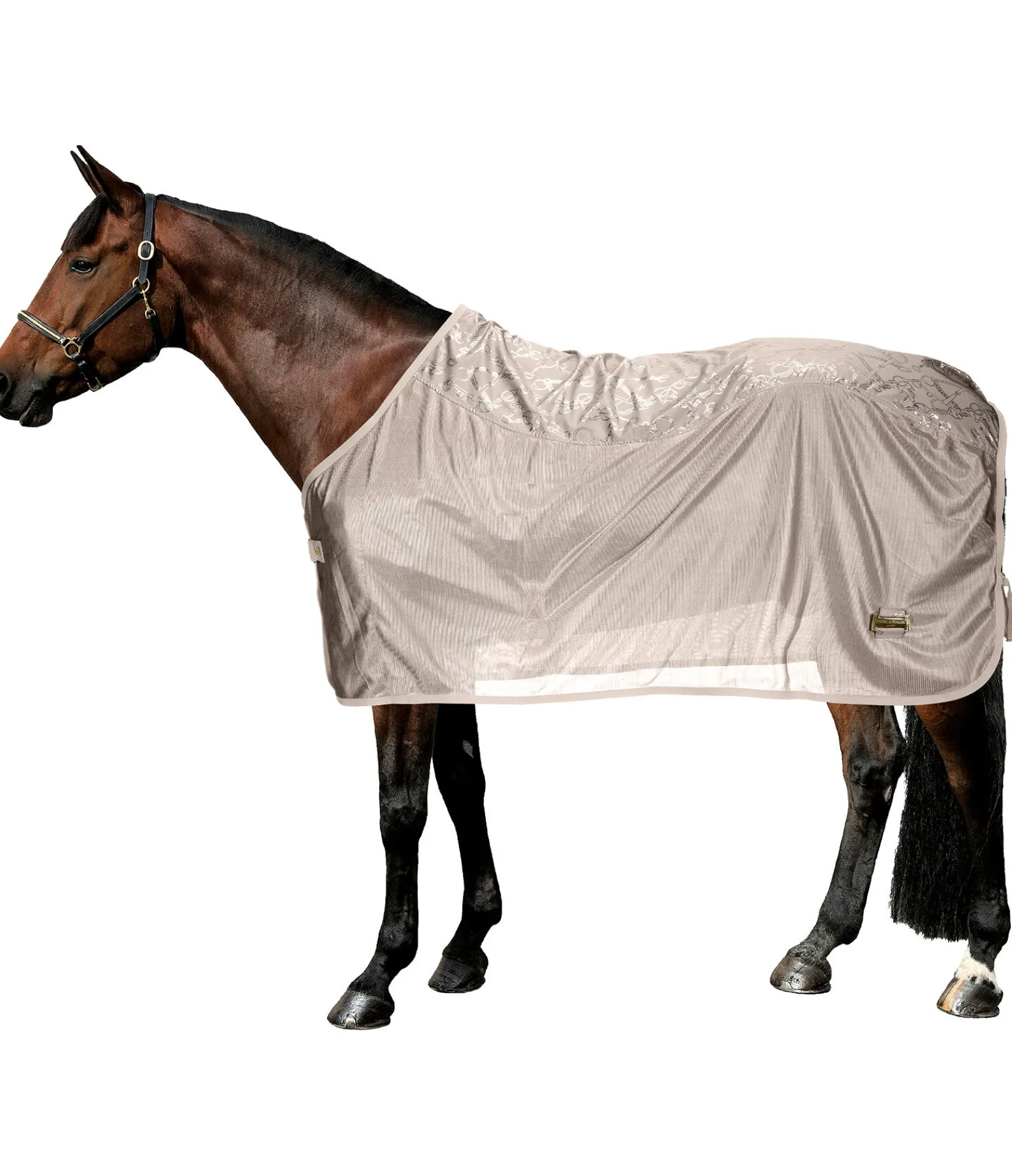 La couverture idéale pour attirer tous les regards ! Couverture chic et légère en fin tissu mesh de la collection Signature avec un imprimé all-over scintillant (reflets dorés en couleur champagne et argentés en couleur noir). L’empiècement imprimé offre une protection contre les courants d’air dans les zones sensibles du dos et des reins du cheval. Ainsi, cette couverture peut aussi être utilisée pour le transport, en concours ou pour couvrir le cheval après le travail pendant les mois d’été. Avec sangle amovible des 2 côtés, fermeture au poitrail en T simple et lanière de queue réglable. Rembourré au niveau des épaules et le long de la colonne pour protéger la robe. 100 % polyester.