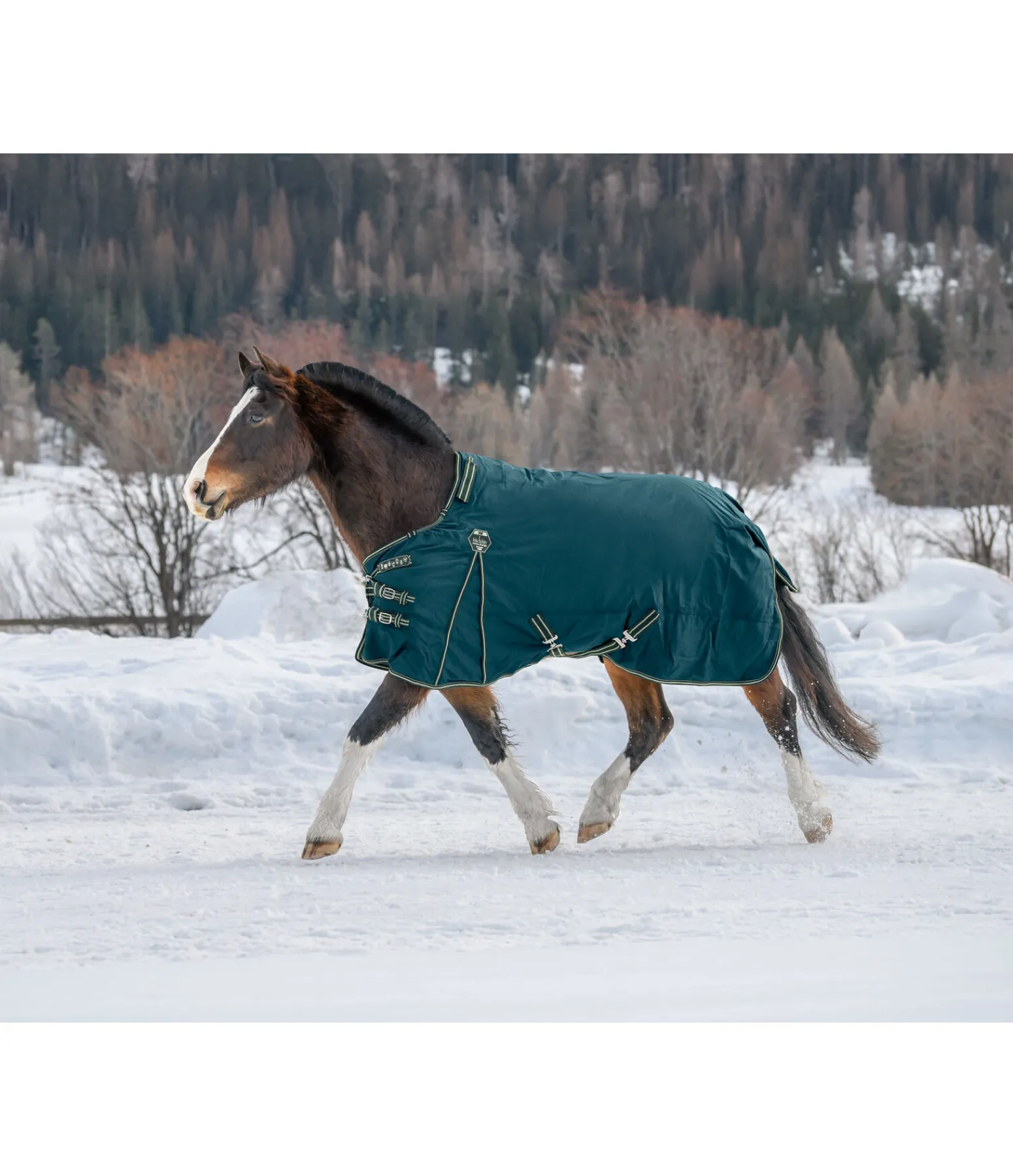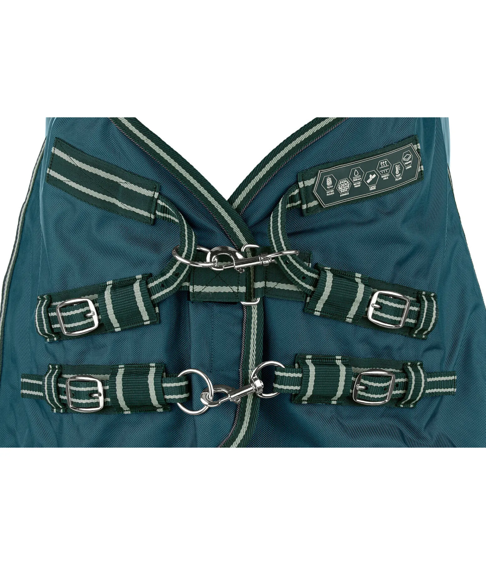 Couverture d’extérieur fonctionnelle et polyvalente dans une coupe classique (Regularneck). Matière 1 680 deniers particulièrement résistante. Grande imperméabilité (5 000 mm). Comparé au polyester, le nylon est nettement plus doux et présente des reflets satinés. Matière beaucoup plus extensible que le polyester pour une meilleure résistance à la déchirure. Sans garnissage. Empiècements extensibles et déperlants en softshell au niveau des épaules et de l’encolure. Grands plis d’aisance pour une liberté de mouvement optimale, permettant d’éviter les pressions. Rembourrage intérieur généreux pour minimiser davantage les pressions au niveau du garrot. Fermeture de poitrail réglable équilibrée en 3 points, constituée de 2 anneaux et 2 mousquetons et d’une patte auto-agrippante supplémentaire. Les mousquetons peuvent être facilement remplacés si besoin. Doublure lisse protégeant la robe. Sursangles croisées réglables et anneaux permettant la fixation de courroies de cuisses (non incluses). Courroie de queue réglable en longueur et rabat de queue avec bandes et passepoil réfléchissants sur le pourtour. Avec fixations supplémentaires pour un couvre-cou optionnel (article 422 669).