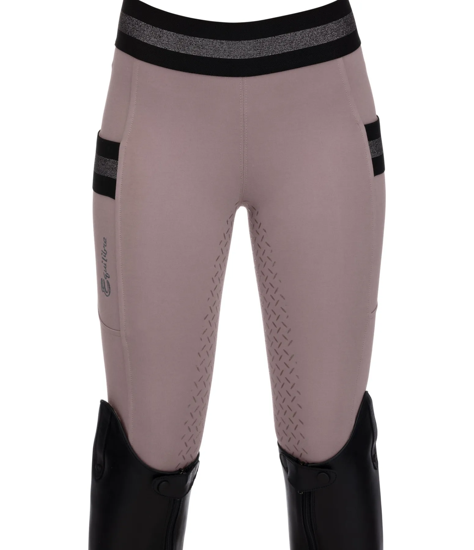 Legging d’équitation sportswear. Matière respirante et très confortable. Fond intégral en silicone. Matière stretch de grande qualité extensible dans 4 directions. Ceinture élastiquée pailletée. Poche pour téléphone portable sur la cuisse. Bas de jambe extensible sans patte auto-agrippante. 68 % viscose, 27 % polyamide, 5 % élasthanne.