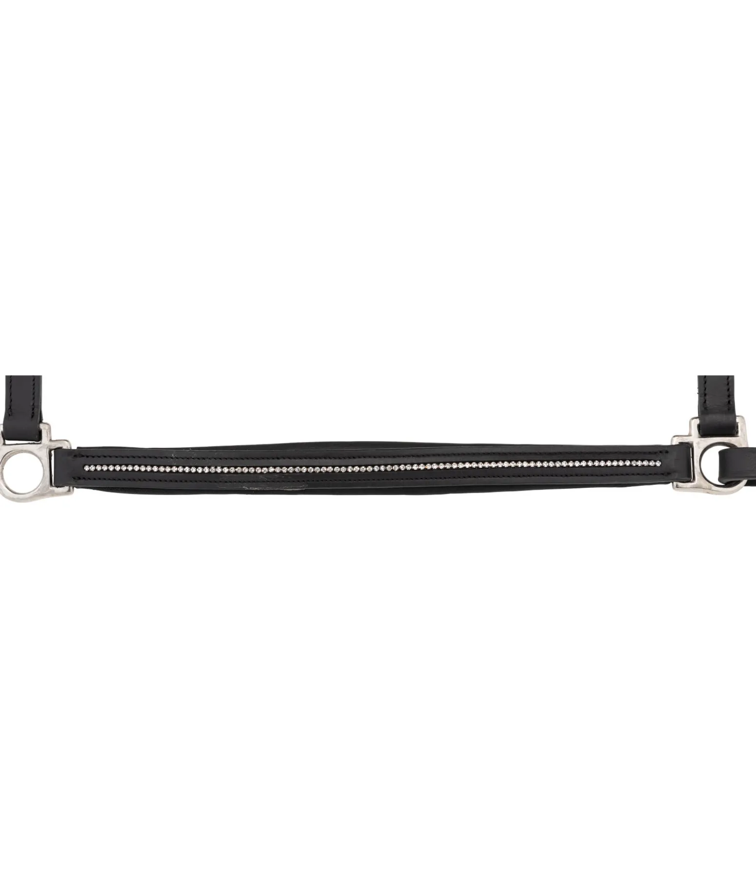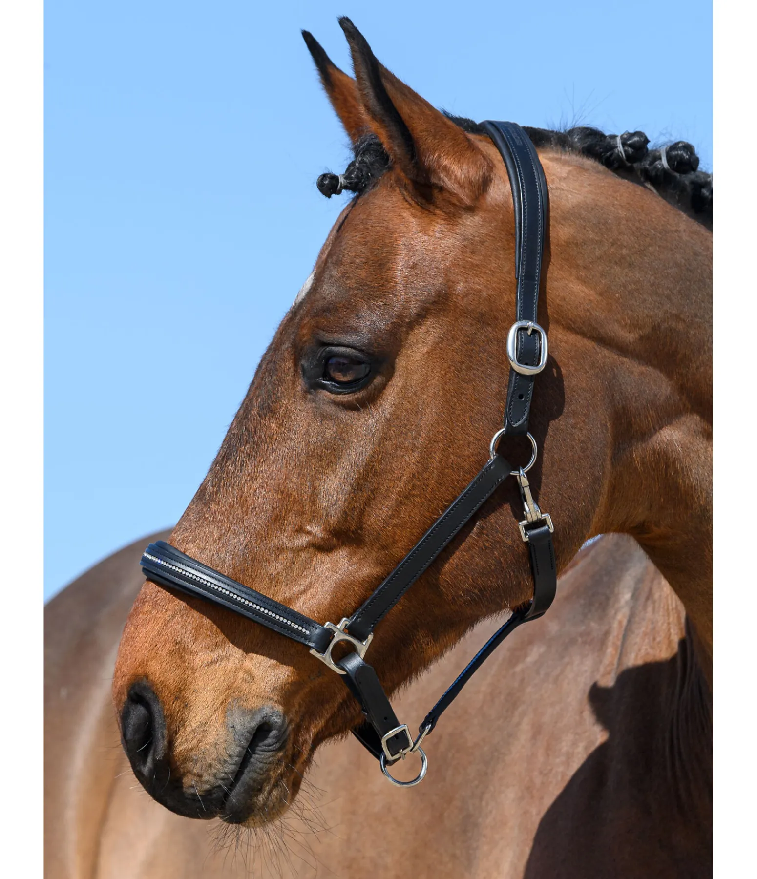 Licol en cuir gras orné d’une rangée de petits strass blancs discrets sur la muserolle. Doublure moelleuse en cuir véritable à la muserolle et la têtière pour un confort optimal. Têtière et muserolle facilement réglables. Bouclerie argentée.