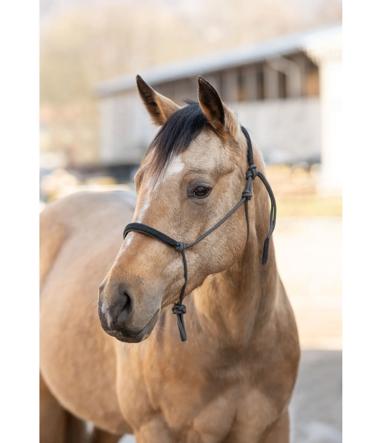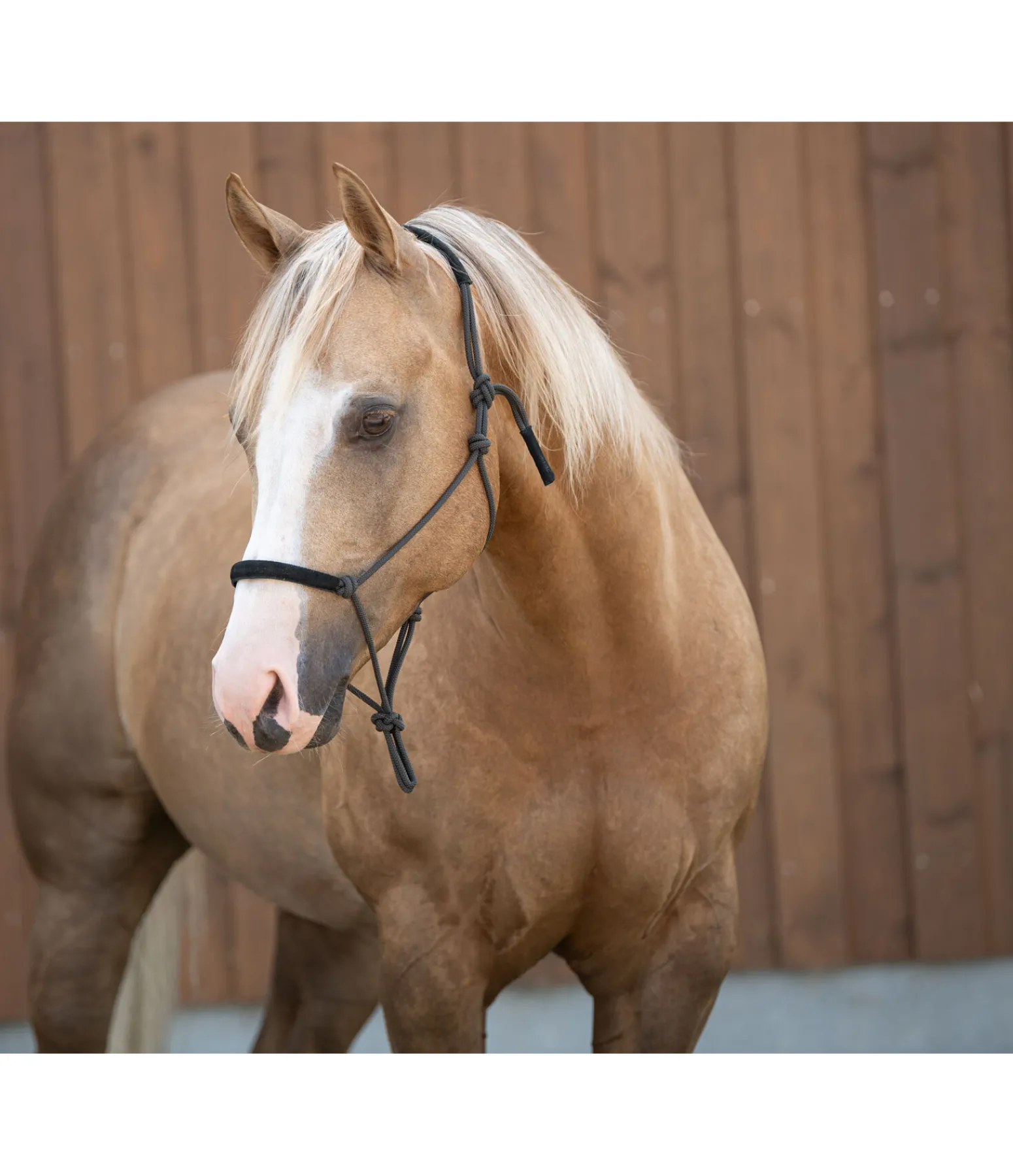 Licol à noeuds robuste. Doublure douce en daim sur la muserolle et la têtière pour plus de confort.