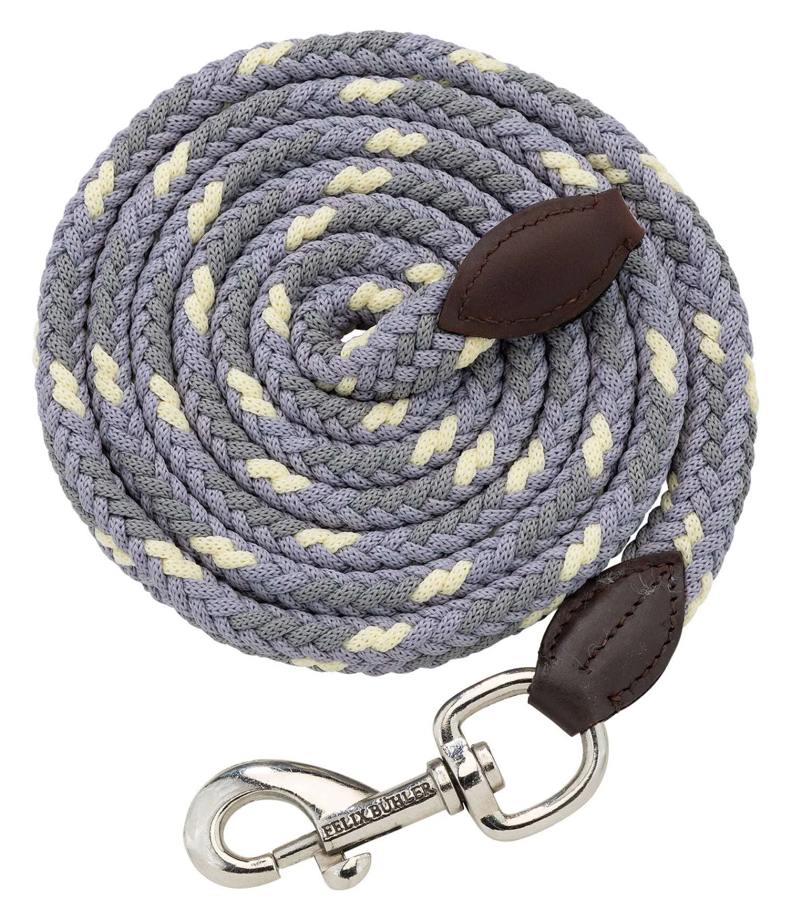 Longe tressée ronde très résistante avec élégants embouts en cuir et mousqueton. Assortie au licol 310040. Bouclerie argentée. 2 m. 100 % polypropylène.