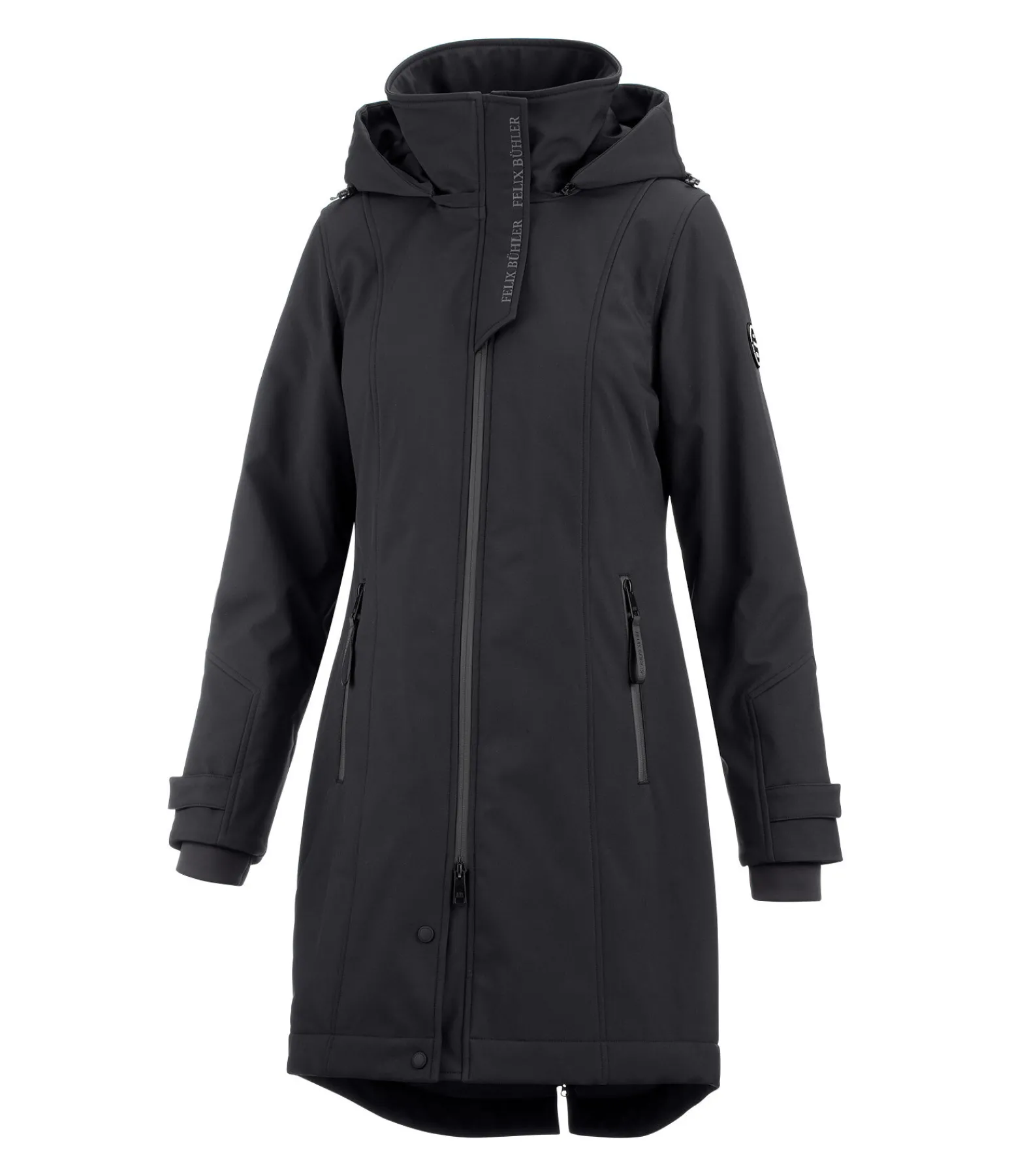 Manteau softshell déperlant et coupe-vent. Col montant avec capuche doublée en jersey, amovible et réglable. Bouton-pression pour fixer la capuche dans le dos. Fermeture à glissière double sens étanche. 2 poches avant zippées. Bas des manches ajustable, élastiqué et coupe-vent. Taille réglable. 1 fente cavalière zippée à l’arrière. Doublure matelassée imitation duvet. 1 poche intérieure zippée. Badge sur la manche et imprimé Felix Bühler sur le col. 94 % polyester, 6 % élasthanne.