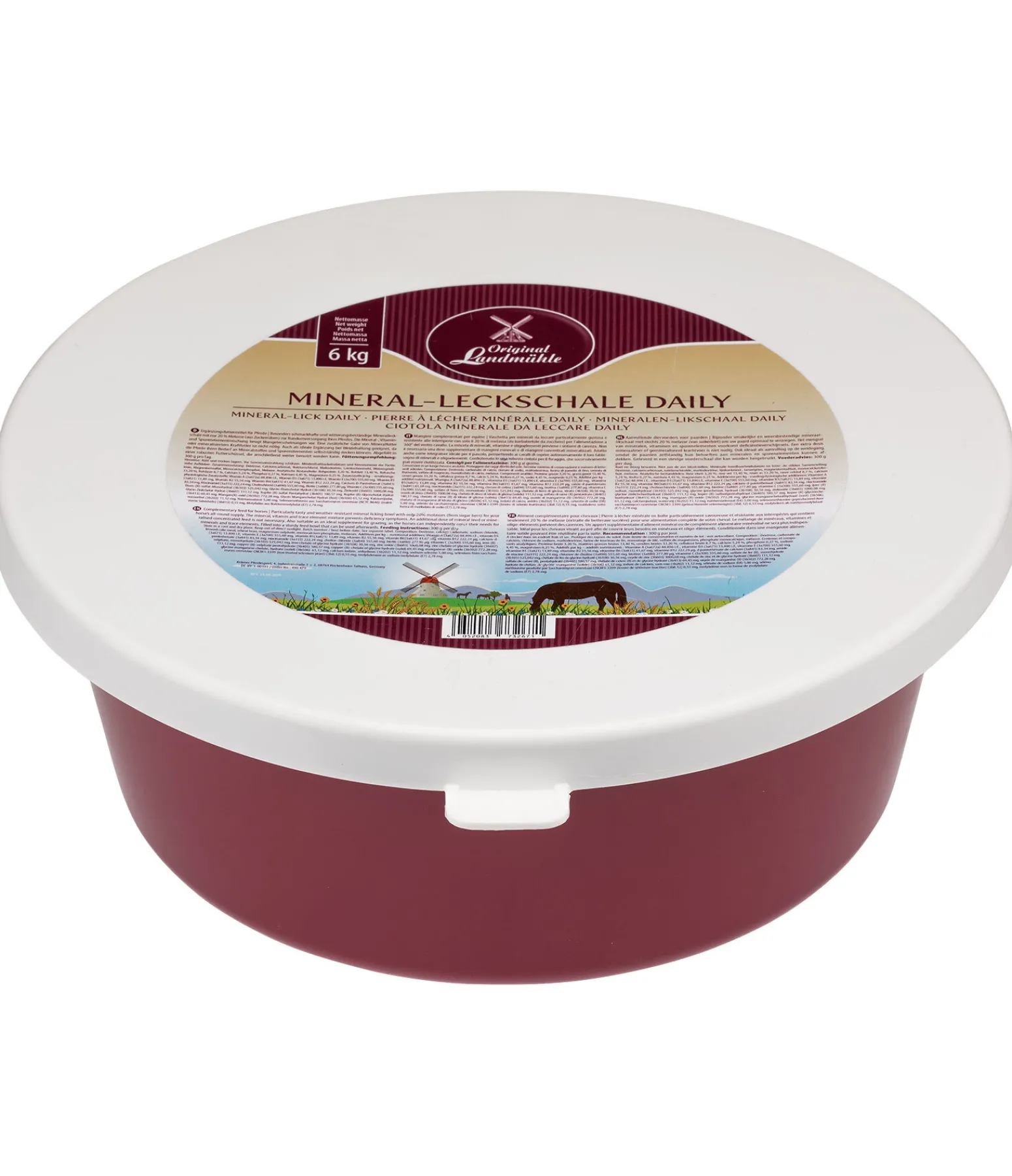 Mélange de minéraux, de vitamines et d’oligo-éléments (aliment complémentaire pour chevaux). Couvre les besoins journaliers en minéraux, vitamines et oligo-éléments essentiels. Des compléments minéraux ou des aliments concentrés minéralisés ne sont alors plus nécessaires. Complément idéal pour les chevaux vivant au pré, car les herbes présentes dans les pâtures ne suffisent souvent pas à couvrir les besoins en minéraux des chevaux à elles seules. La pierre à lécher est fixée dans une boîte en plastique rigide réutilisable avec couvercle moulé adapté, dans une optique de réduction des déchets.