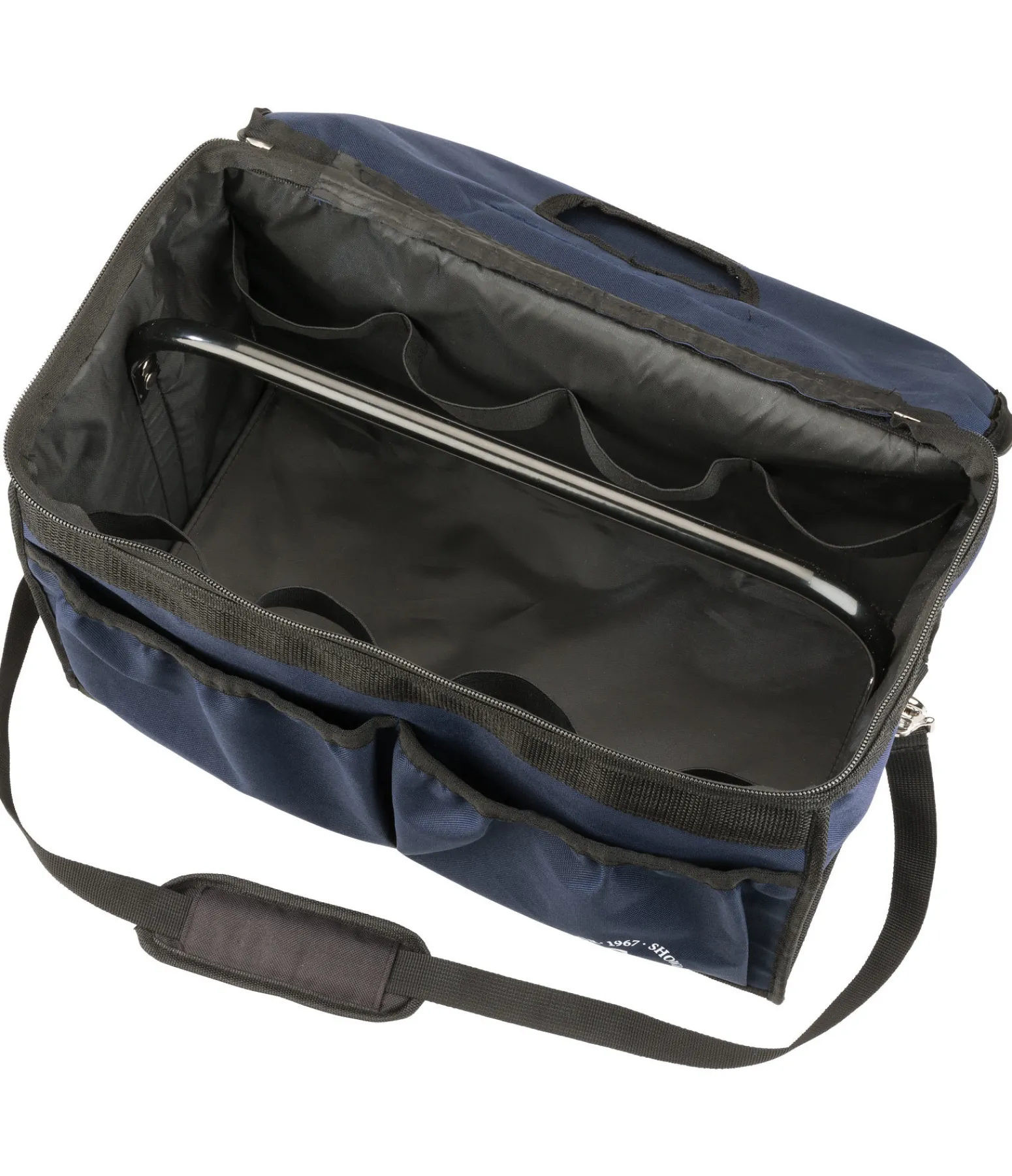 Le sac de pansage SHOWMASTER EasyGo est particulièrement pratique à transporter grâce à la barre métallique intérieure servant de poignée. Un rabat sur le haut du sac permet de l’atteindre facilement, sans laisser pénétrer la saleté. Ce sac possède deux poches et deux filets à l’extérieur ainsi qu’une bandoulière amovible. À l’intérieur, plusieurs élastiques permettent de maintenir les flacons en position verticale, afin d’éviter qu’ils ne se déversent dans le sac. 45 x 30 x 23 cm. 100 % Polyester.