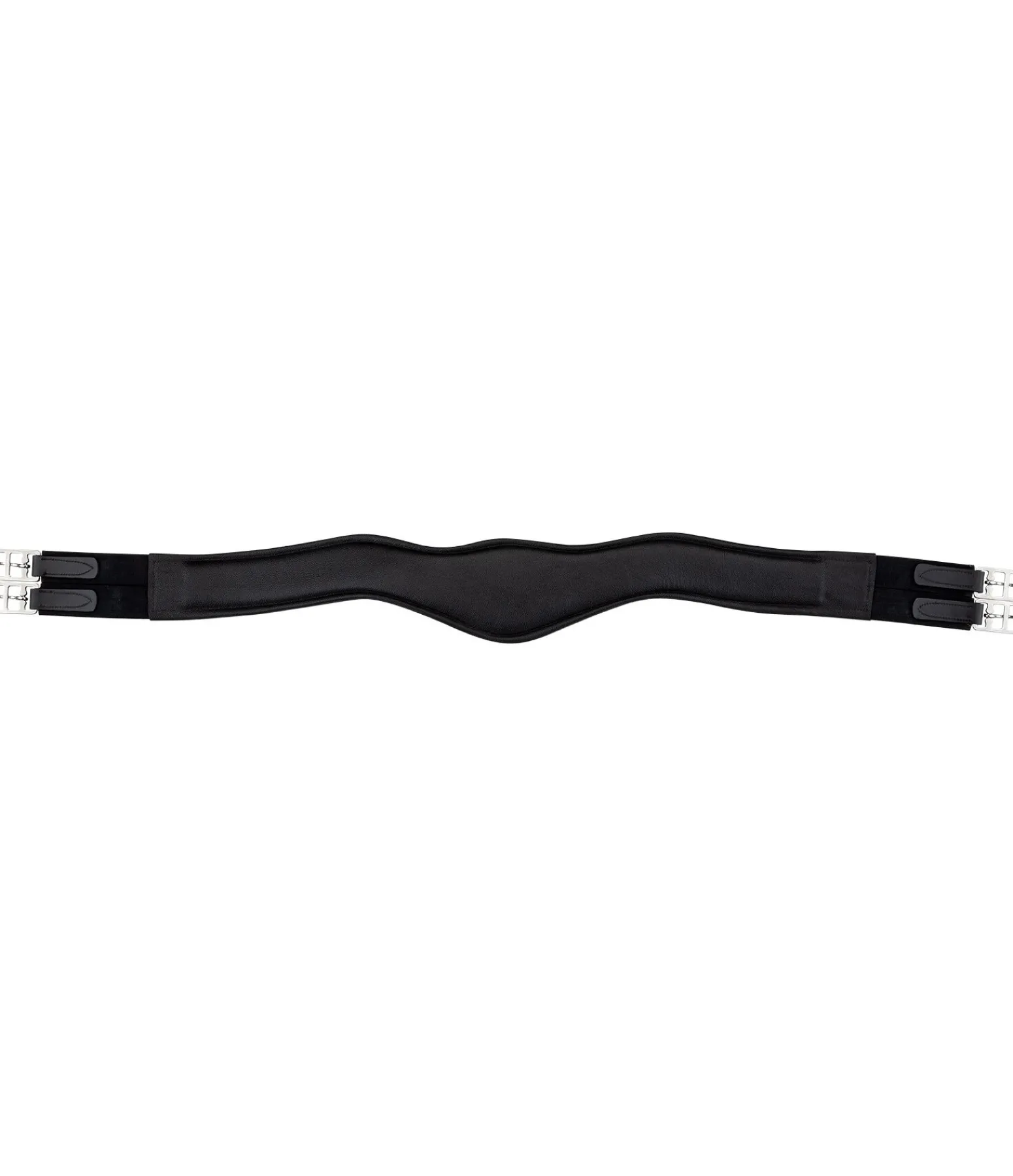 Sangle en cuir anatomique avec doublure douce. Trois anneaux en D, empiècements élastiqués des deux côtés et boucles à rouleau. Largeur de la sangle 8,5 à 13 cm.