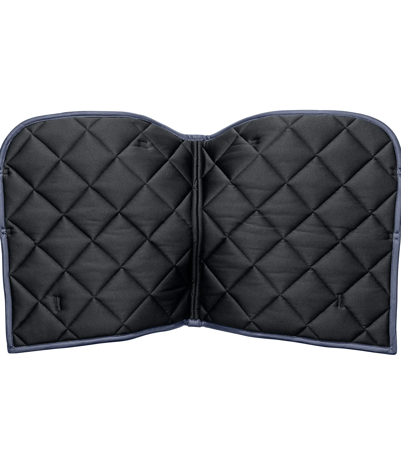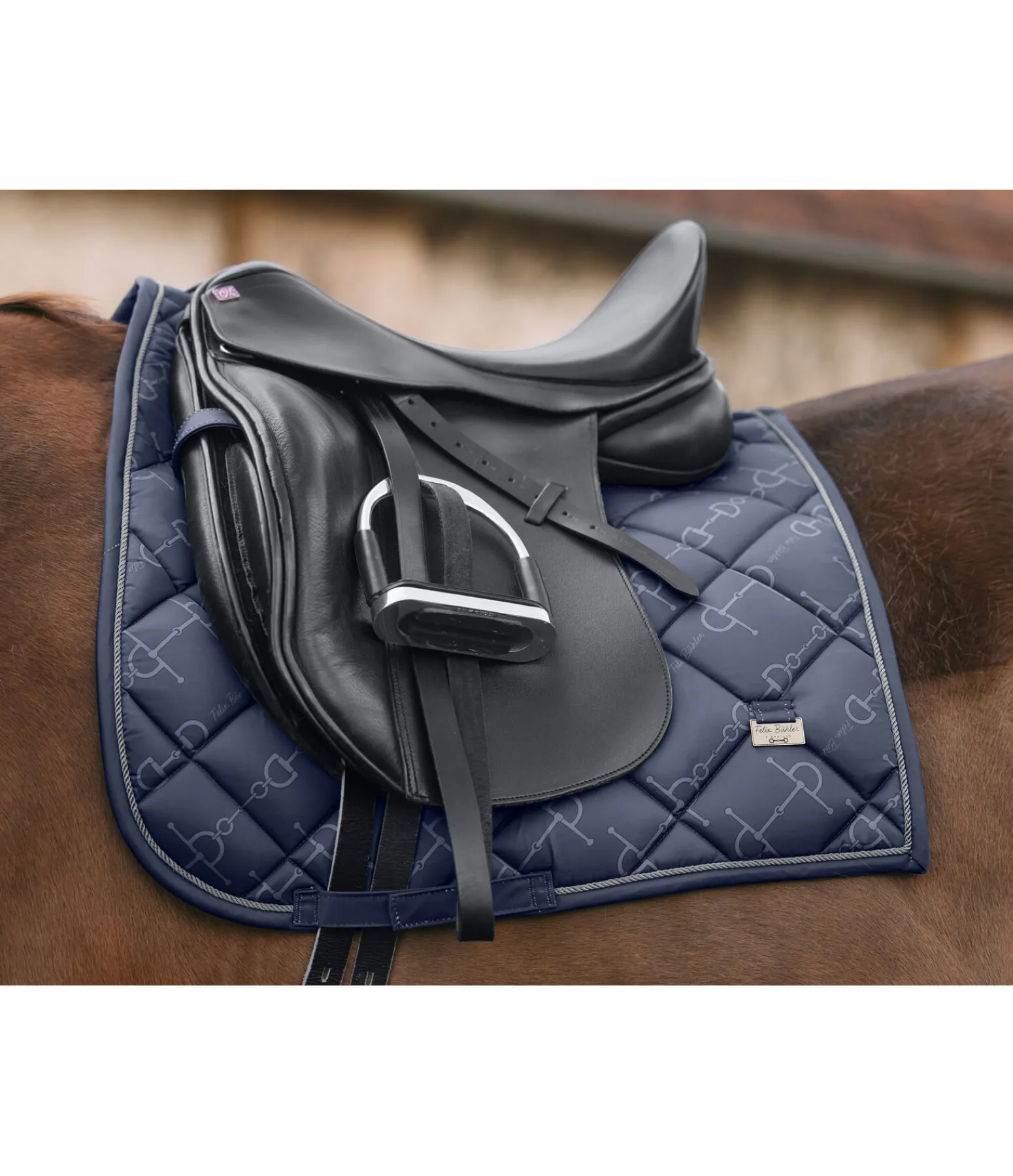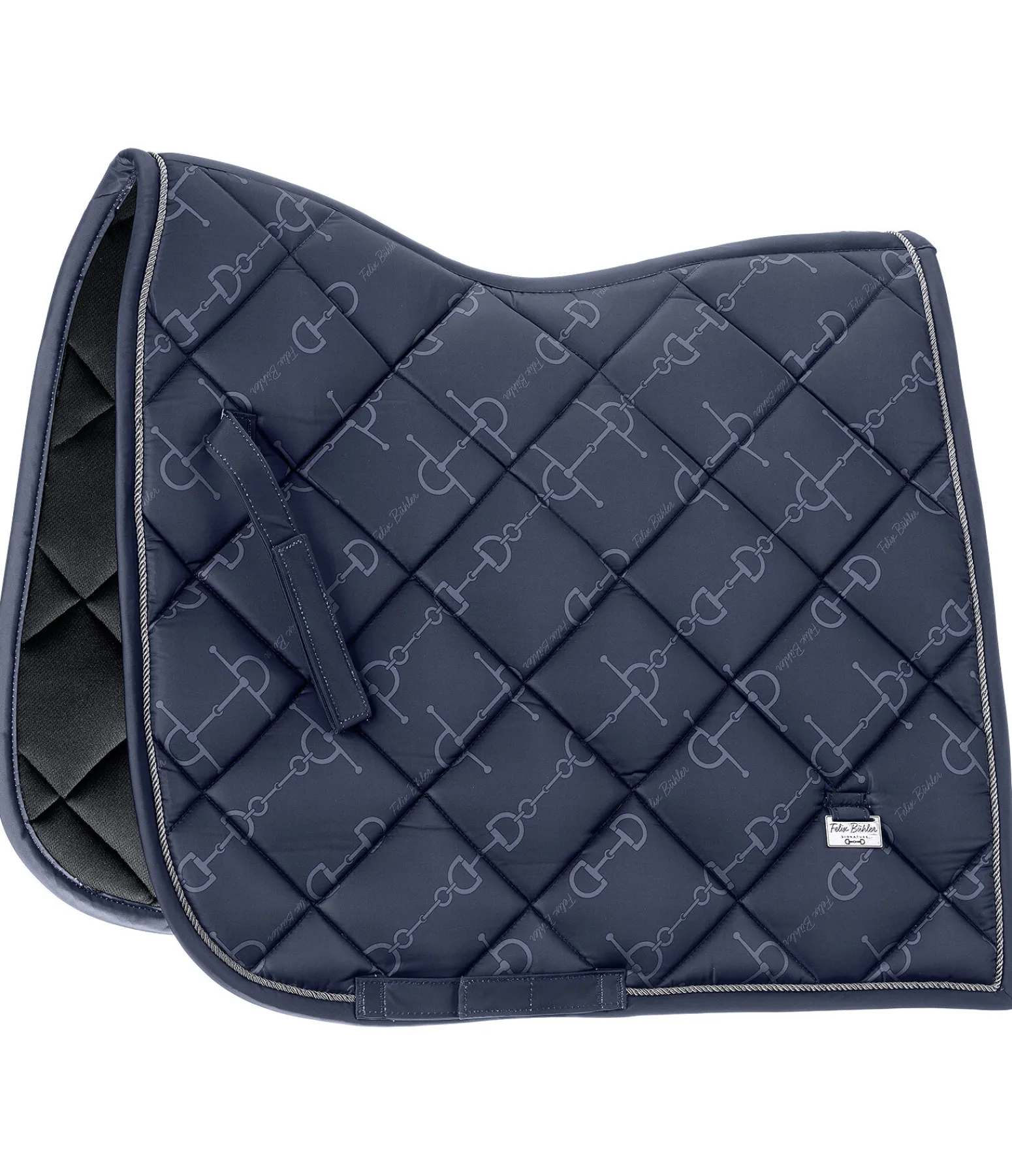 Élégant tapis de selle de forme carrée avec plaque logo métallique de chaque côté. Cordon décoratif anthracite et imprimé all-over discret à motif mors tendance. Passants de sangle et de contre-sanglons avec pattes auto-agrippantes pratiques. Dessous en Air mesh respirant et absorbant l’humidité. 100 % polyester.
