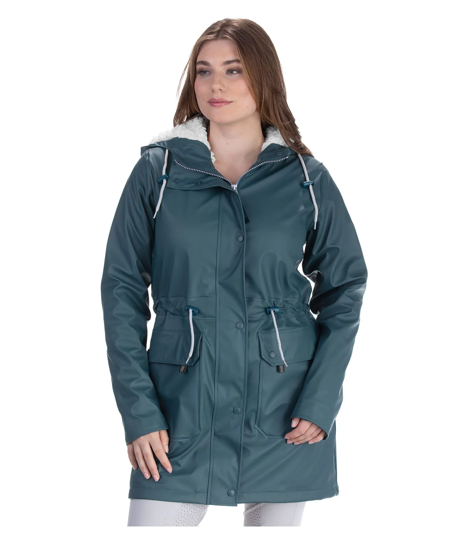 Veste d’équitation de pluie douce et chaude avec doublure intégrale en polaire Teddy. Large capuche réglable en cas de forte pluie. Imperméable et coupe-vent. Fermeture à glissière double sens dissimulée. 2 poches latérales à rabat avec boutons-pression. Taille ajustable par cordon de serrage. 1 fente cavalière avec boutons-pression à l’arrière. Imprimé STEEDS sur la manche et la capuche. 100 % polyuréthane, doublure en polaire Teddy 100 % polyester.