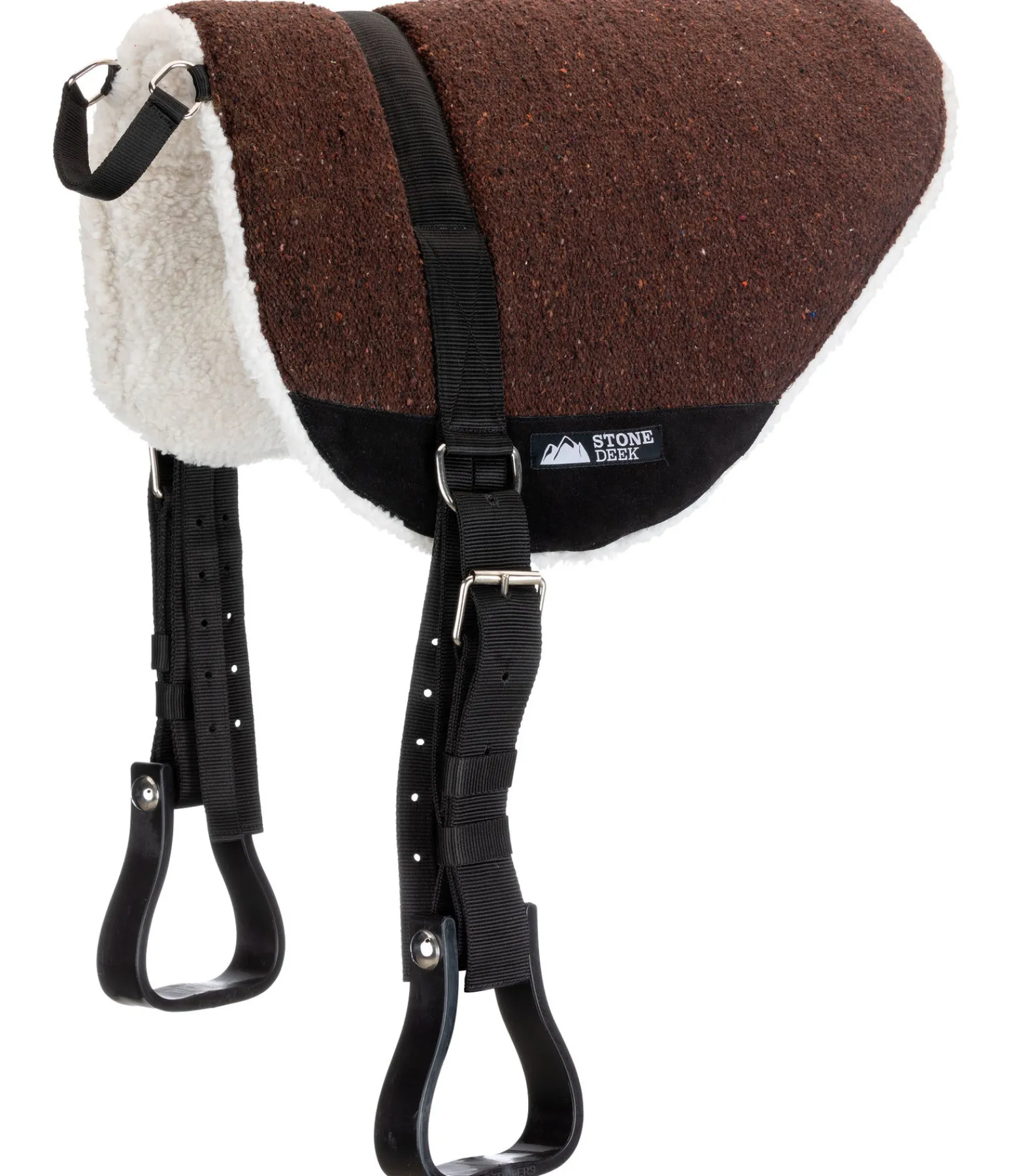 Pad de monte à cru intégralement doublé de polaire Teddy pour monter sans selle. Étriers western amovibles, sangle et poignée inclus. Convient pour trouver un équilibre à cru et corriger sa position.